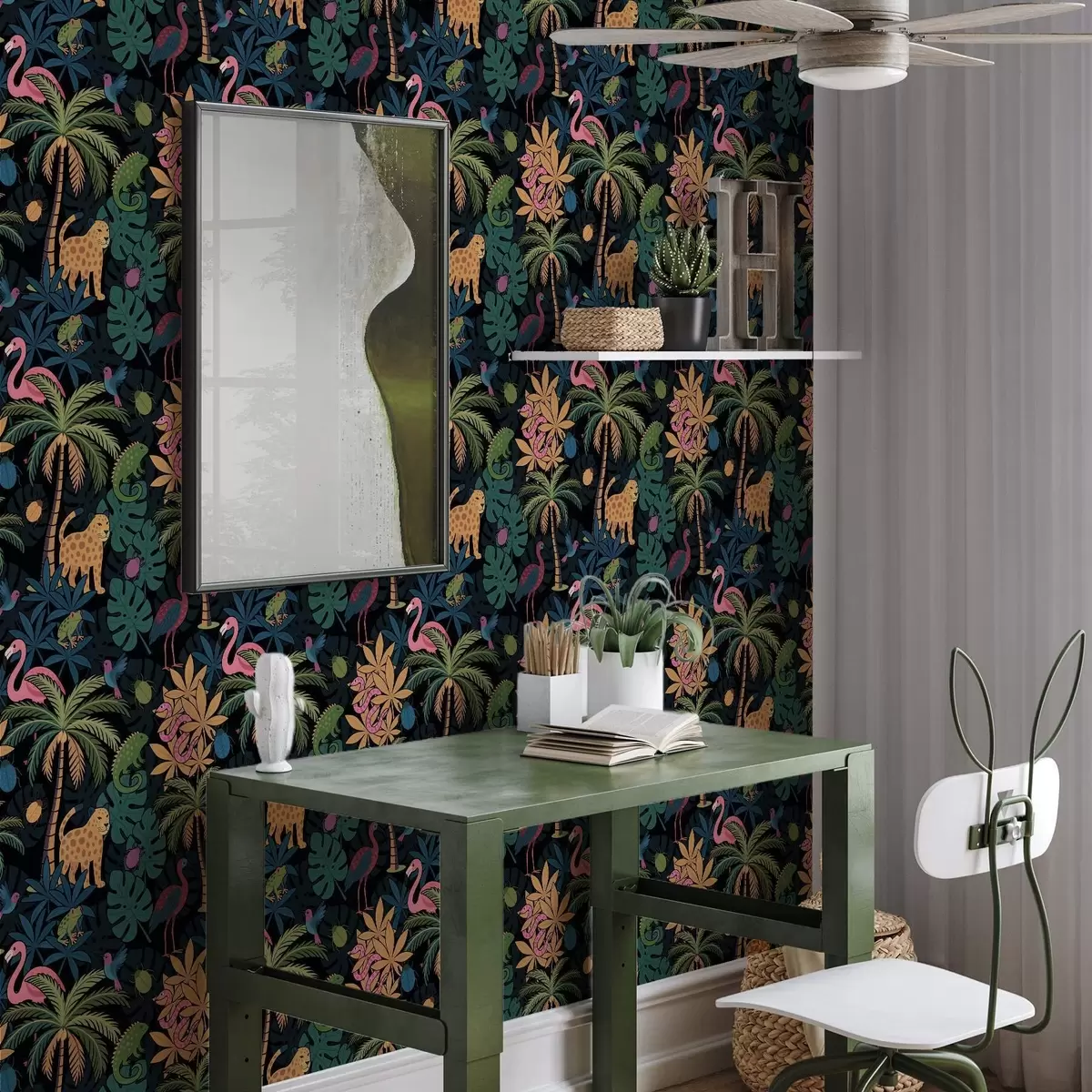 Behang Heldere tropische dieren tussen het gebladerte op een donkere achtergrond Nr. a00701