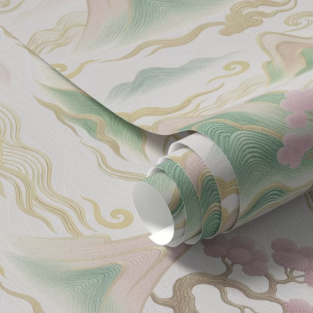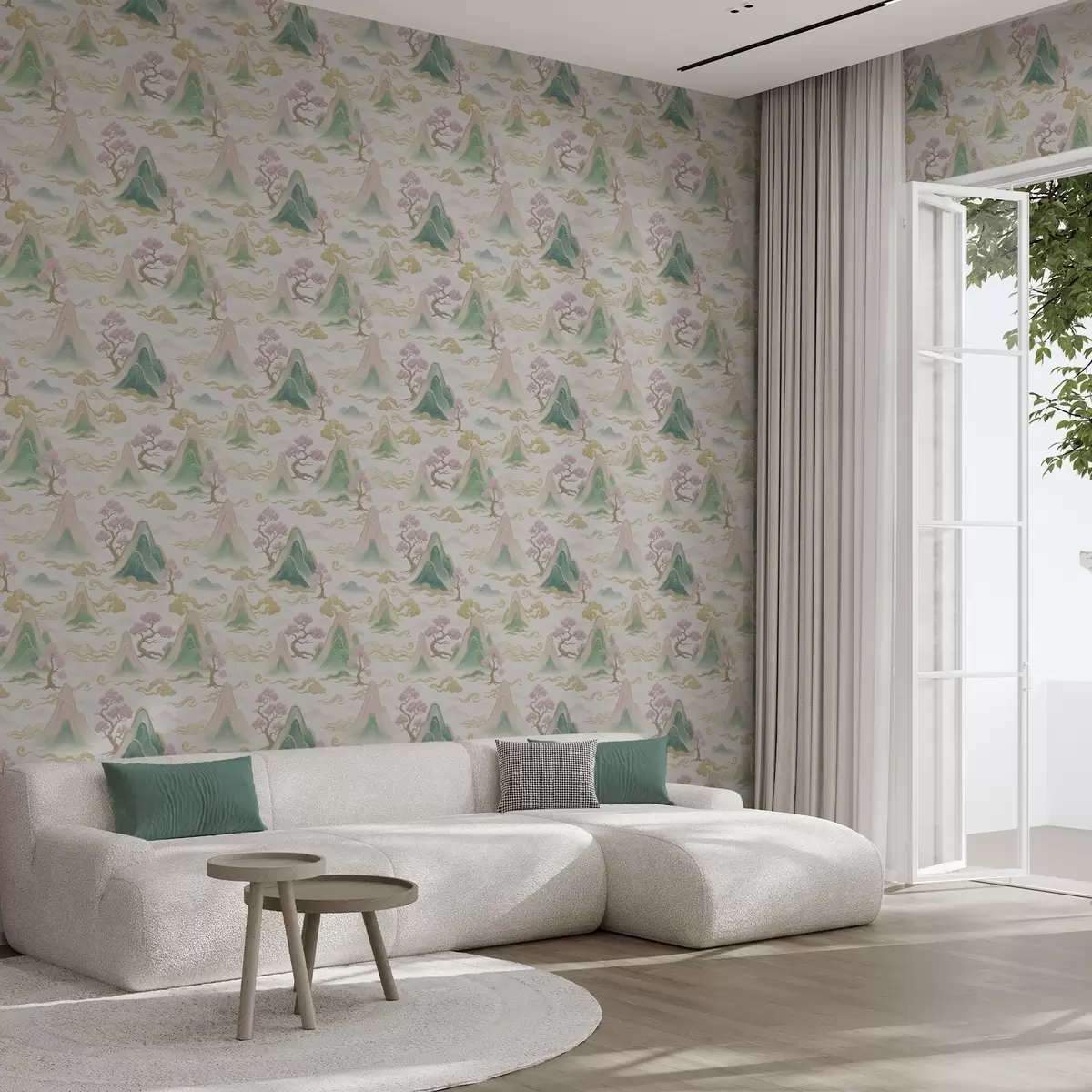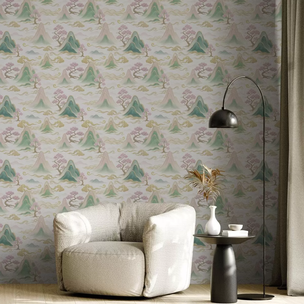 Behang Bergen, wolken en dennenbomen in een oosterse decoratieve stijl Nr. a00703