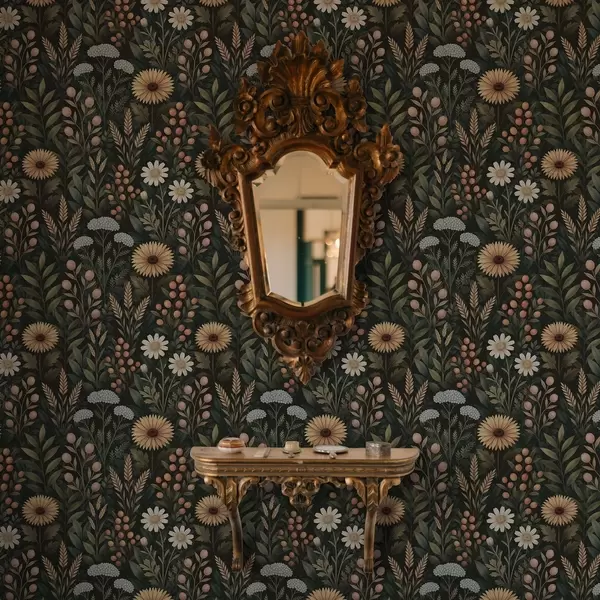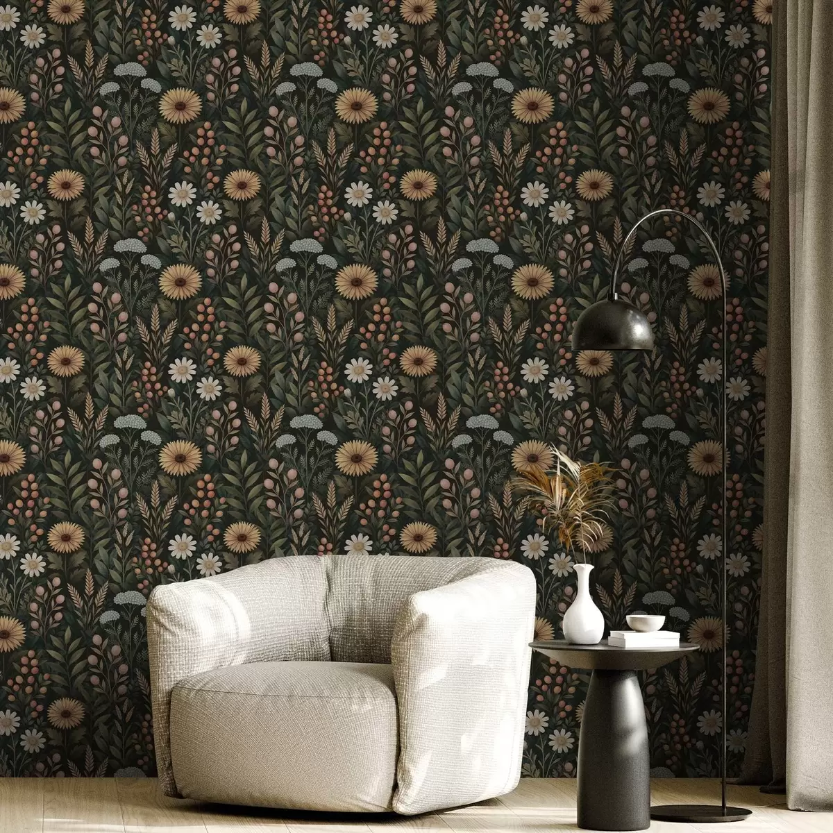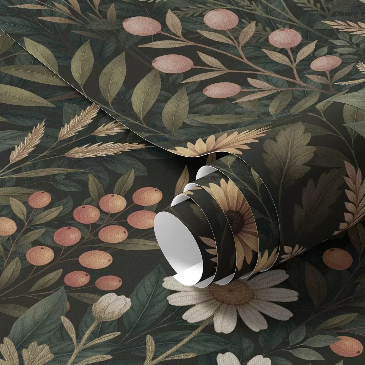 Behang Wilde bloemen en bessen op een donkere achtergrond, natuurlijk ornament Nr. a00707