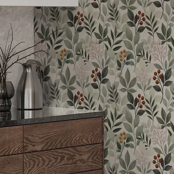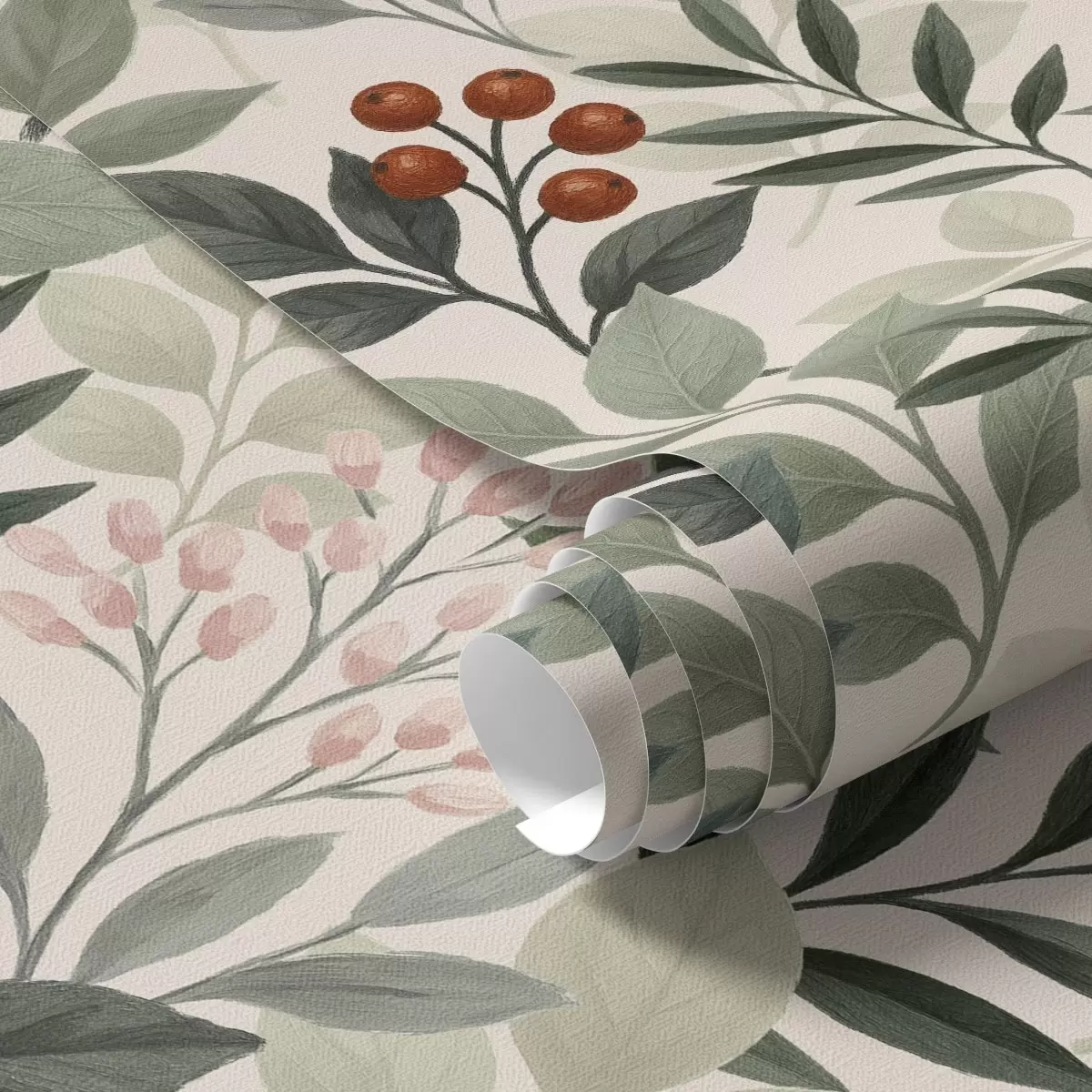 Behang Bladeren met bessen, lichte achtergrond Nr. a00713