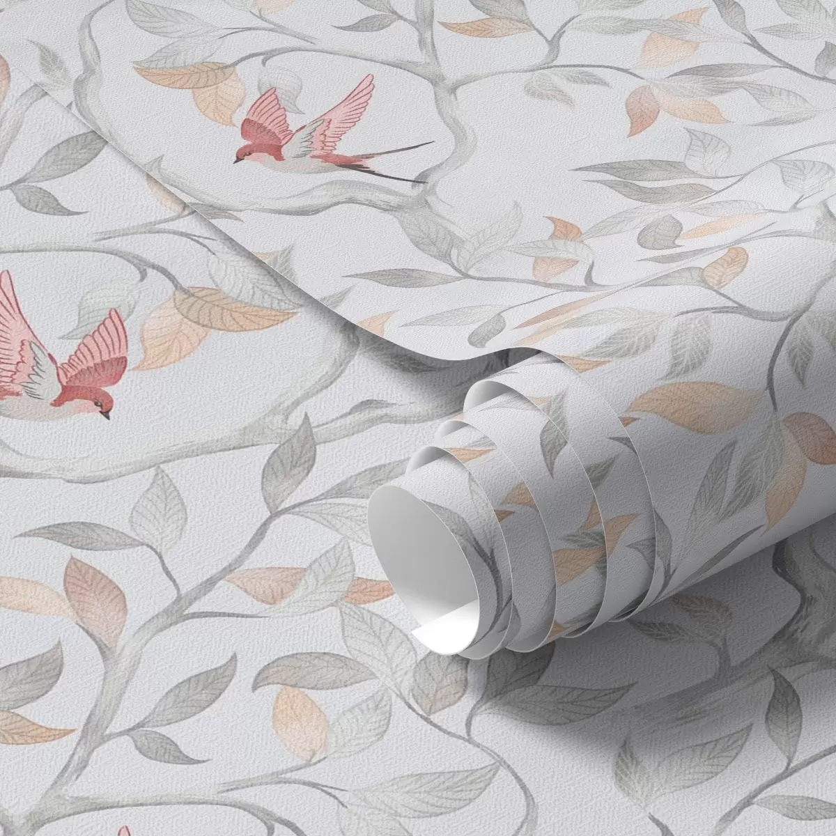 Behang Lichte takken met bladeren en vogels in perzikkleurige tinten Nr. a00716