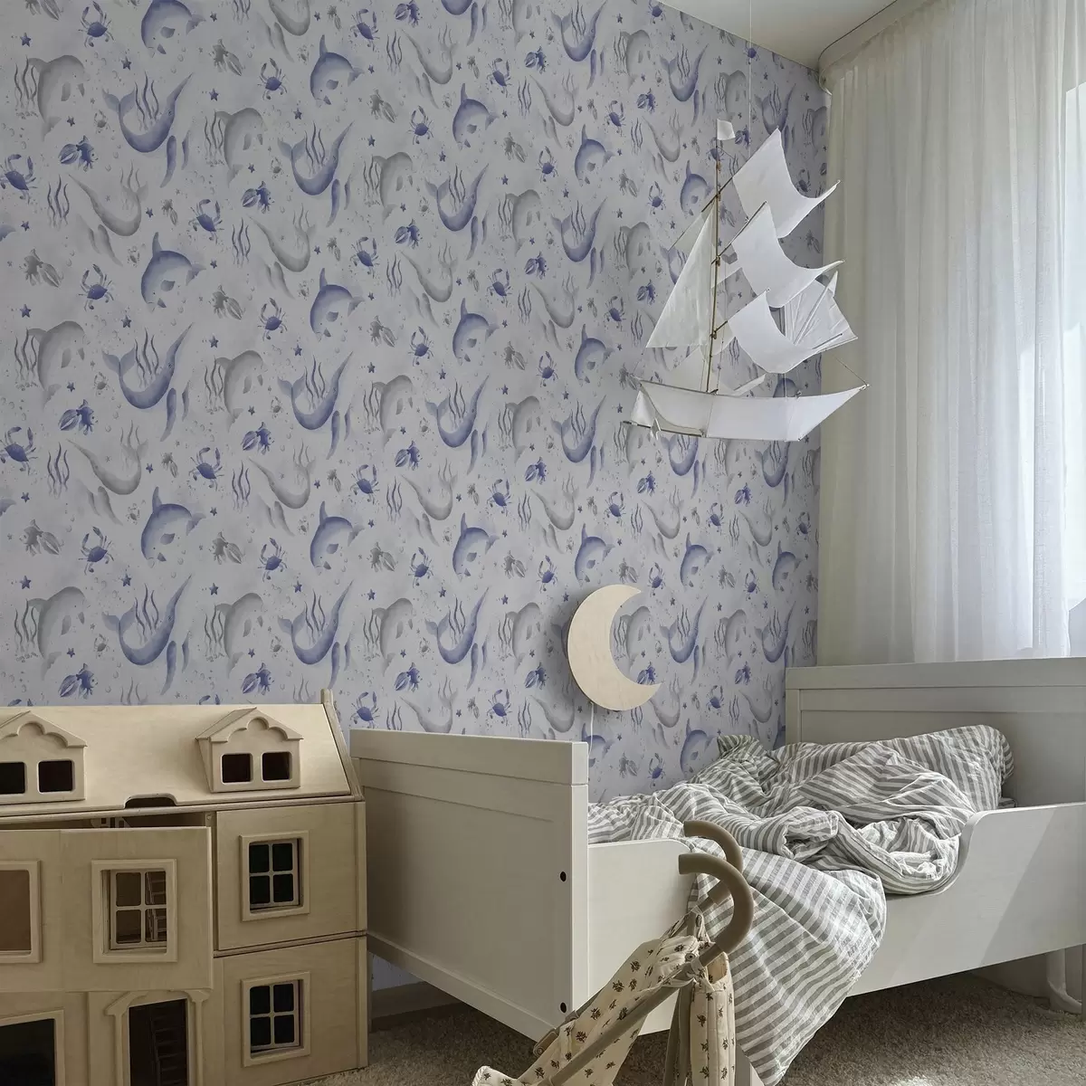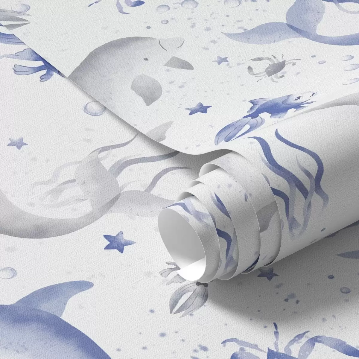 Behang Zeewalvissen en dolfijnen in blauwe tinten op een witte achtergrond Nr. a00720v1
