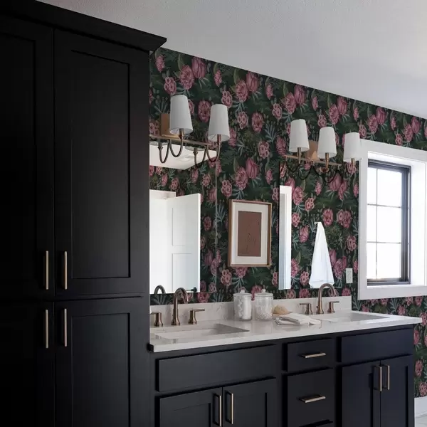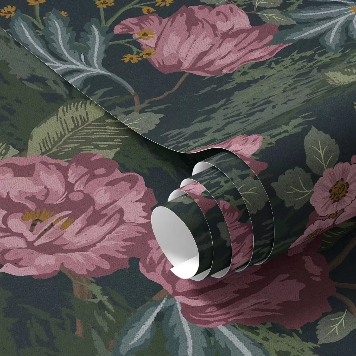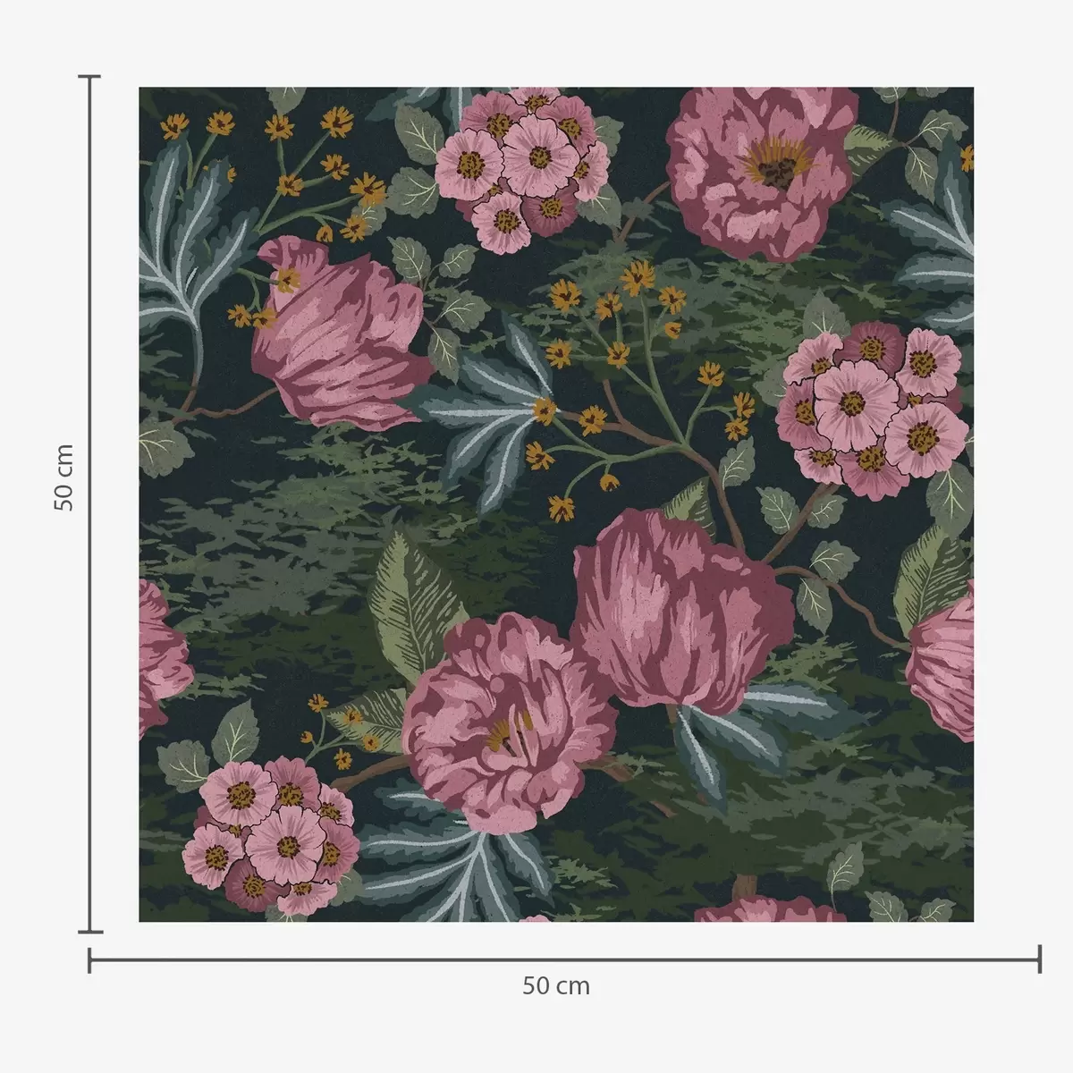 Behang Donkere flora met roze bloemen en bladeren, diepe achtergrond Nr. a00724