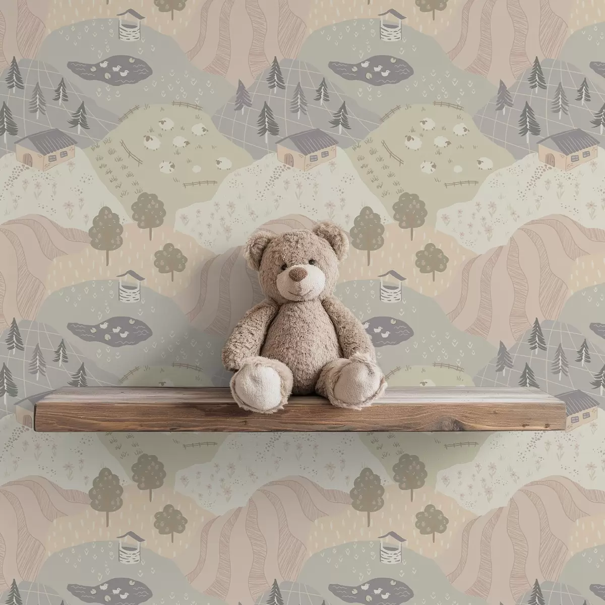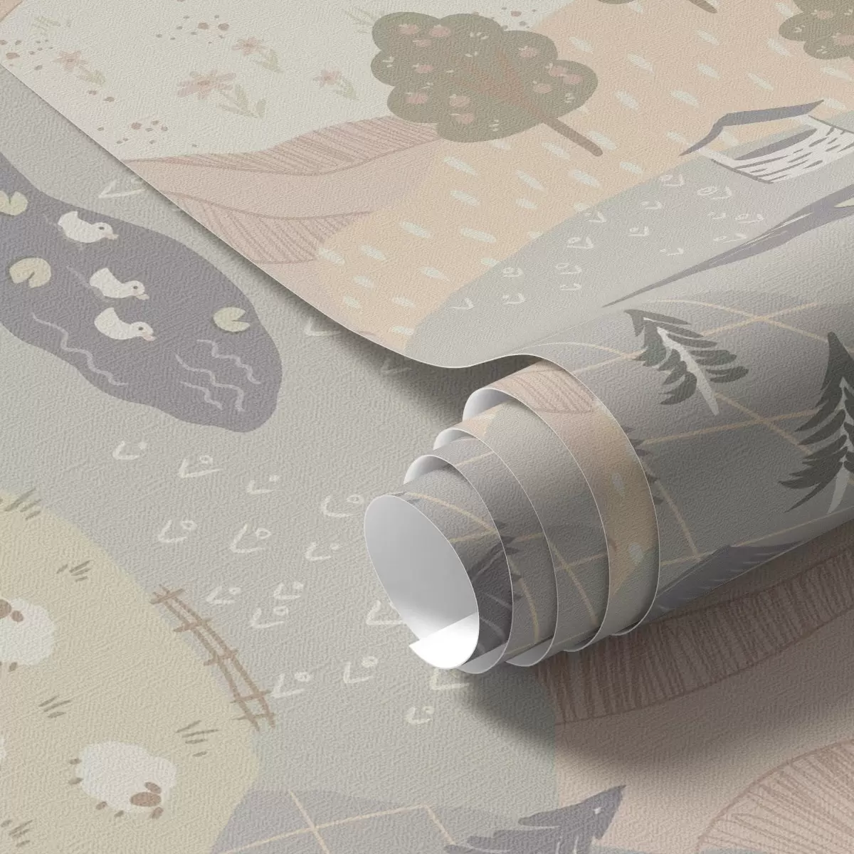 Behang Sprookjesachtig landschap met bomen, ganzen en schapen Nr. a00728