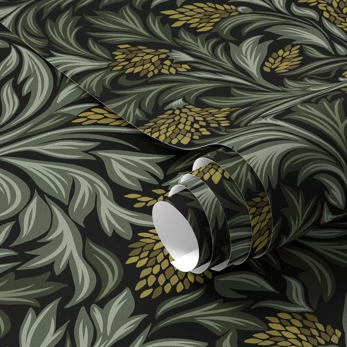 Behang Donkere acanthusbladeren met gouden kegels op zwart Nr. a00745