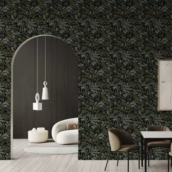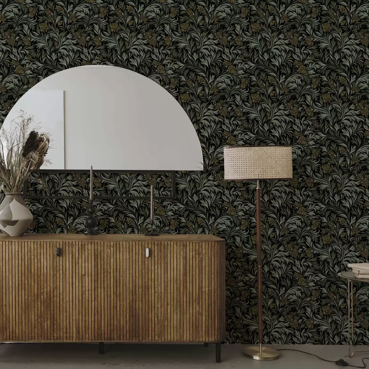 Behang Donkere acanthusbladeren met gouden kegels op zwart Nr. a00745