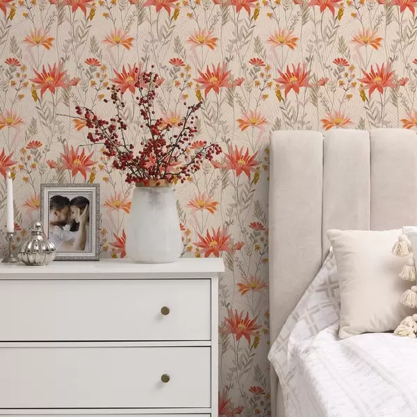 Behang Wilde bloemen in warme tinten op beige achtergrond Nr. a00751