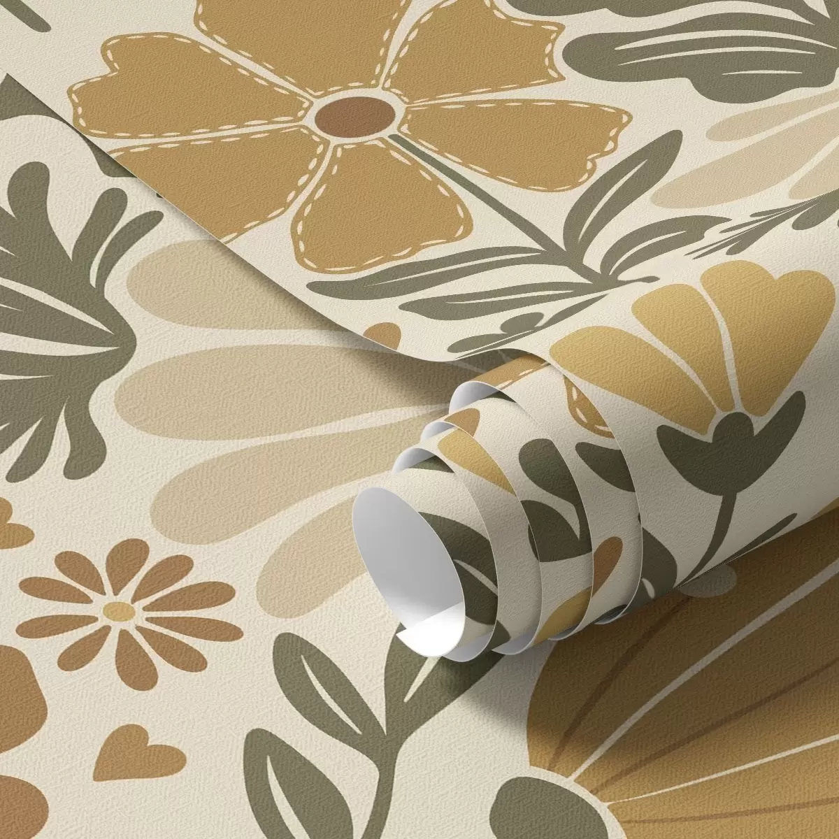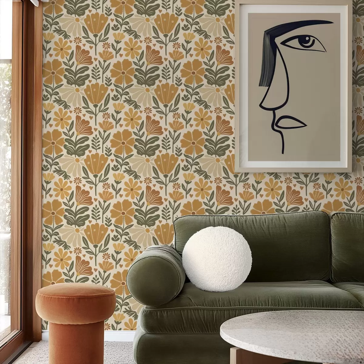 Behang Gestileerde bloemen in warme tinten met hartjes Nr. a00752