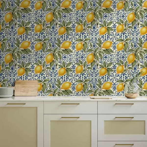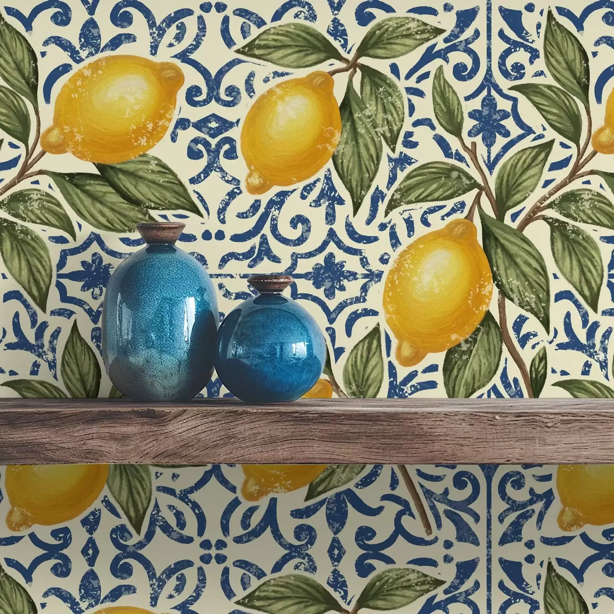 Behang Citroentakken met blauwe decoratieve achtergrond Nr. a00763