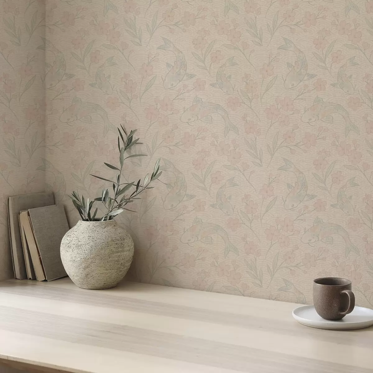 Behang Karpers tussen bloemen in zachte beige-roze tinten Nr. a00766