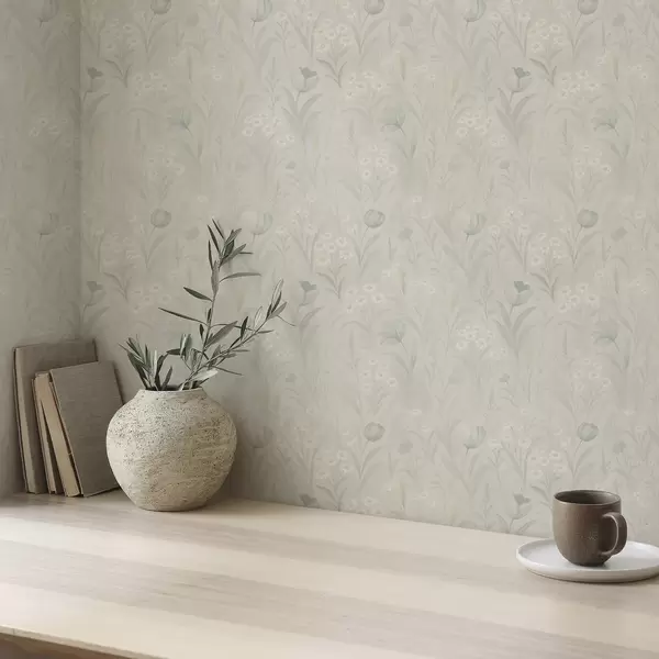 Behang Zachte weide met tulpen en madeliefjes, pastelkleurige salie Nr. a00779