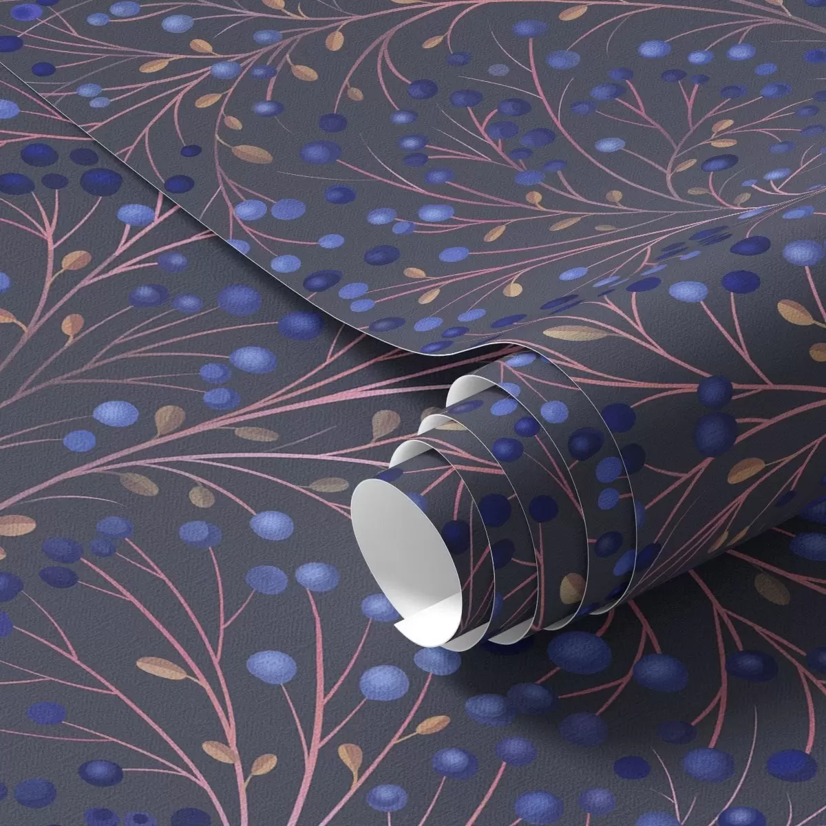 Behang Roze-bruine takken en blauwe bessen op een grafietkleurige achtergrond Nr. a00787