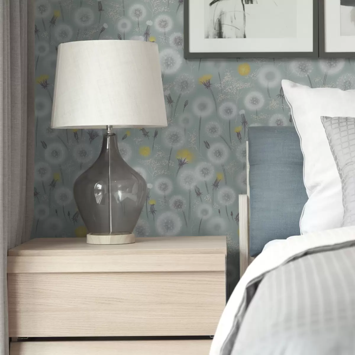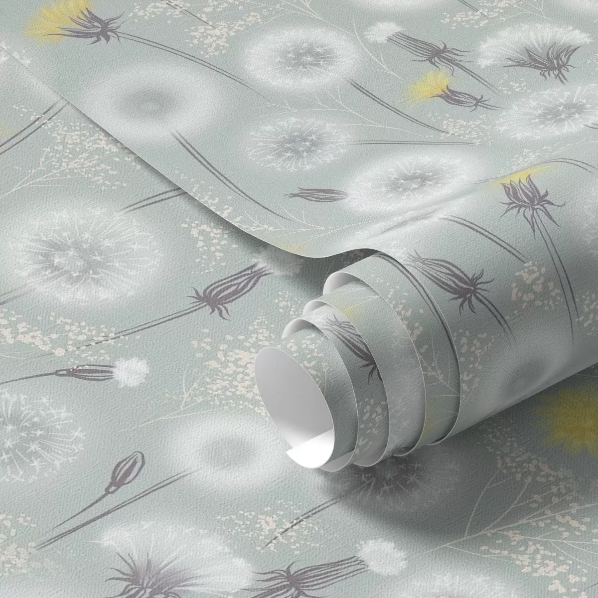 Behang Pluizige paardenbloemen en zaden op een muntgroene achtergrond Nr. a00790