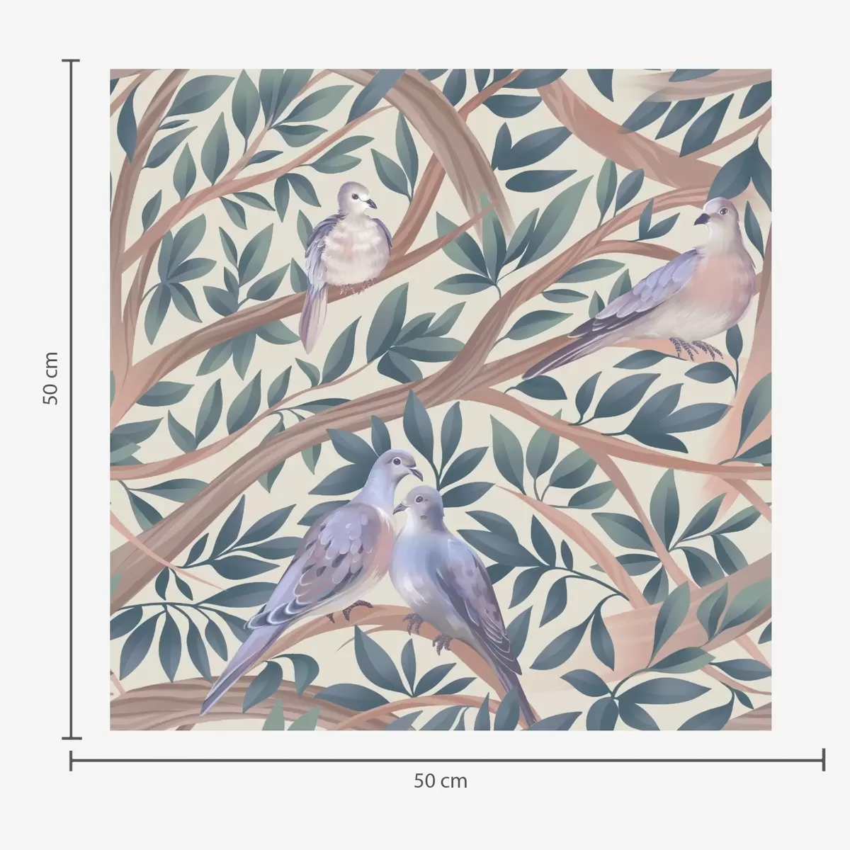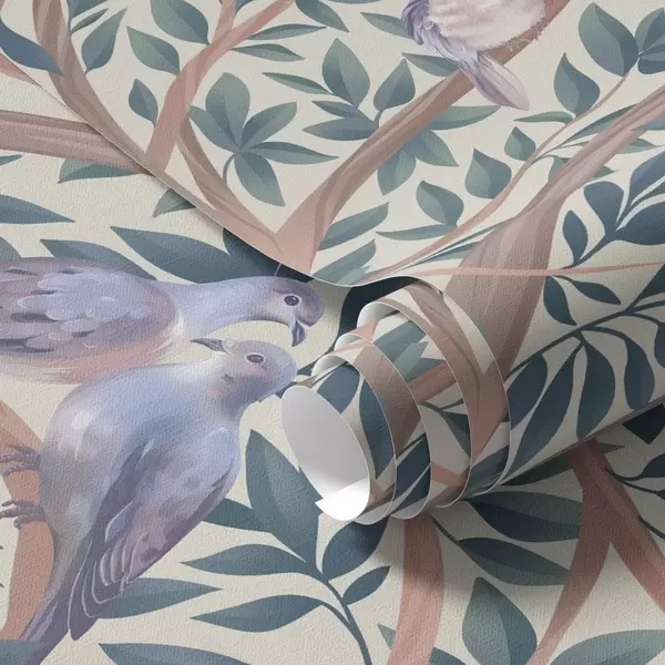 Behang Duiven tussen takken en bladeren in een zacht pastelpalet Nr. a00796