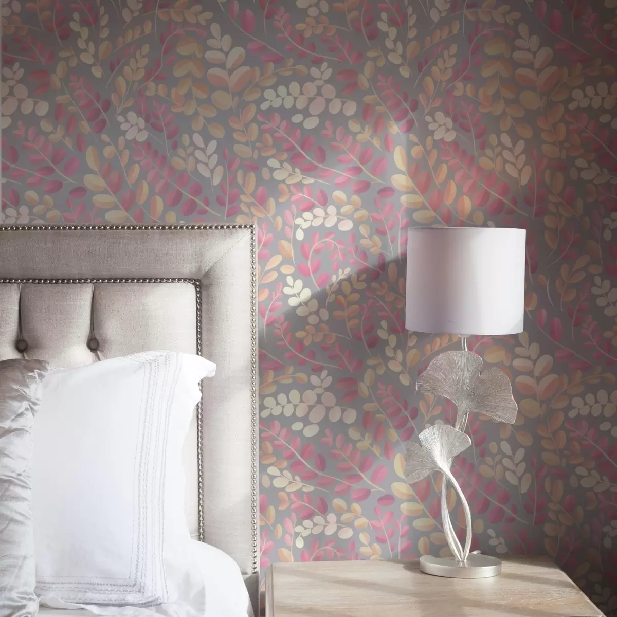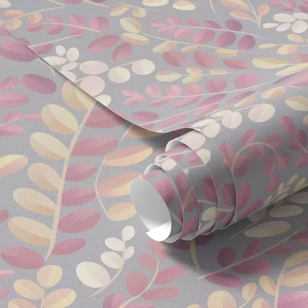Behang Pastelkleurige takken met roze-perzikkleurig gebladerte op een grijze achtergrond Nr. a00799v1