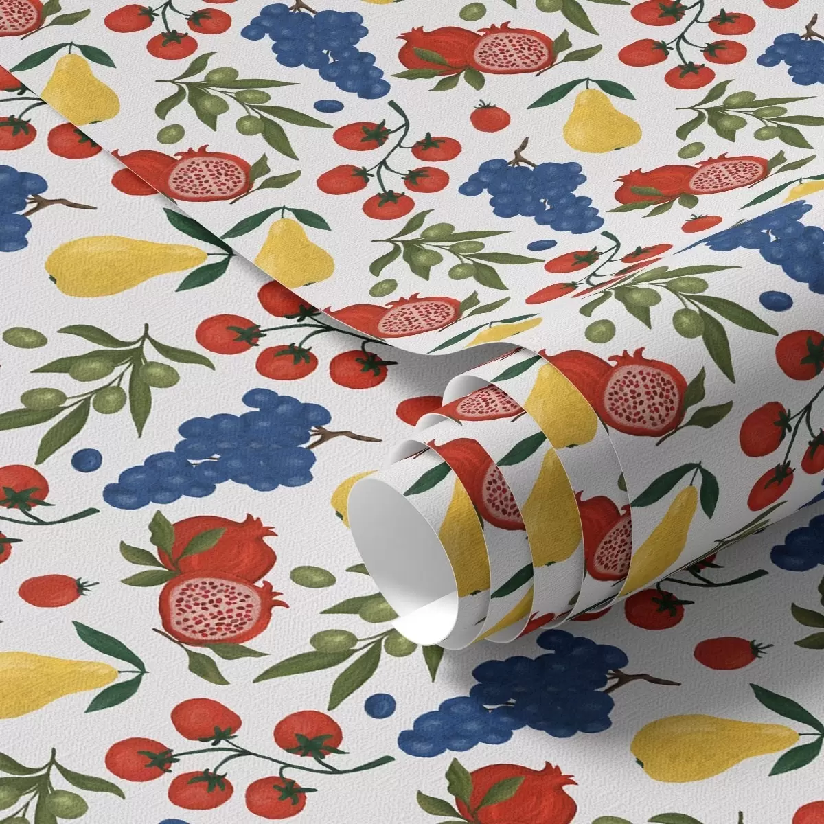 Behang Sappig fruit: granaatappels, druiven, peren op een witte achtergrond Nr. a00801