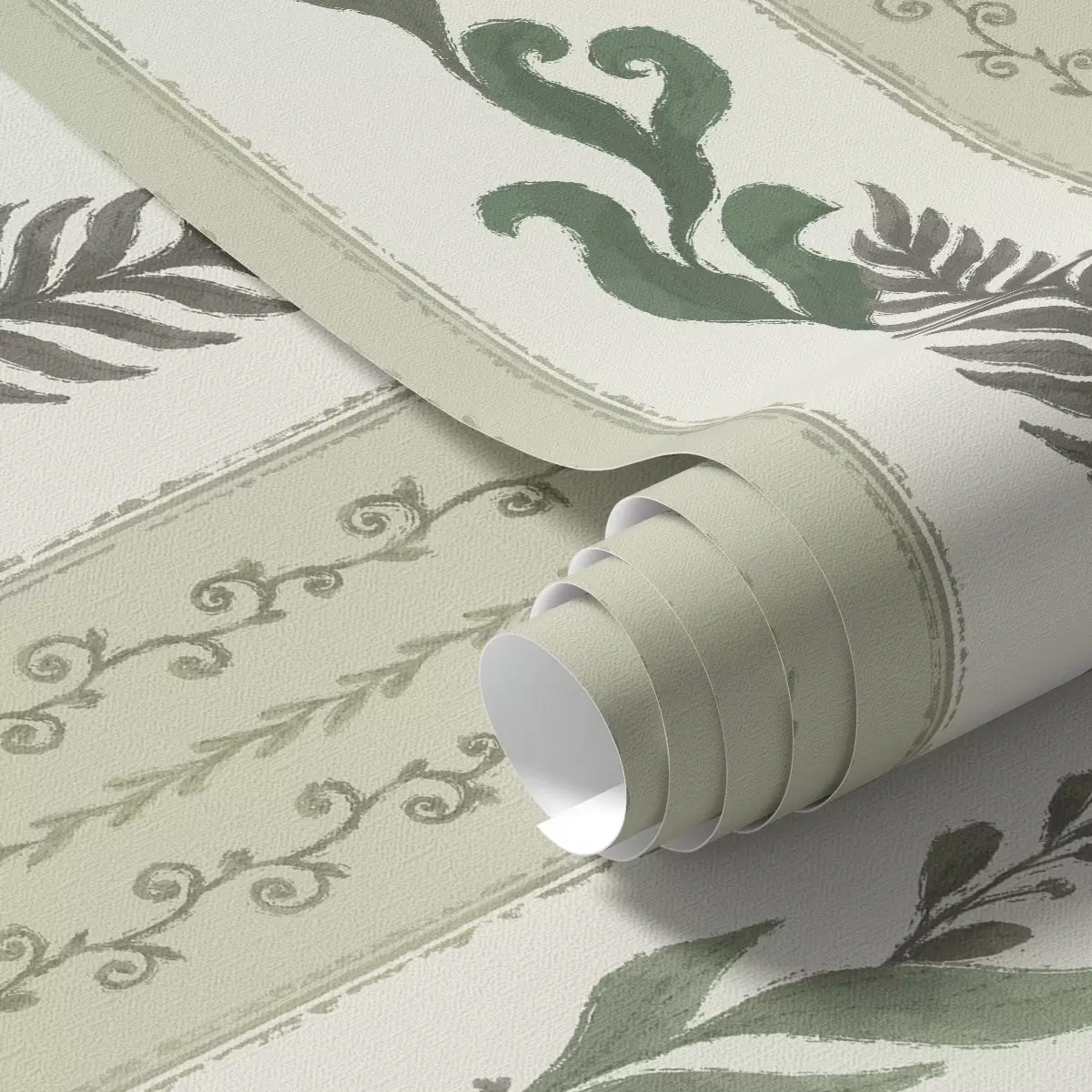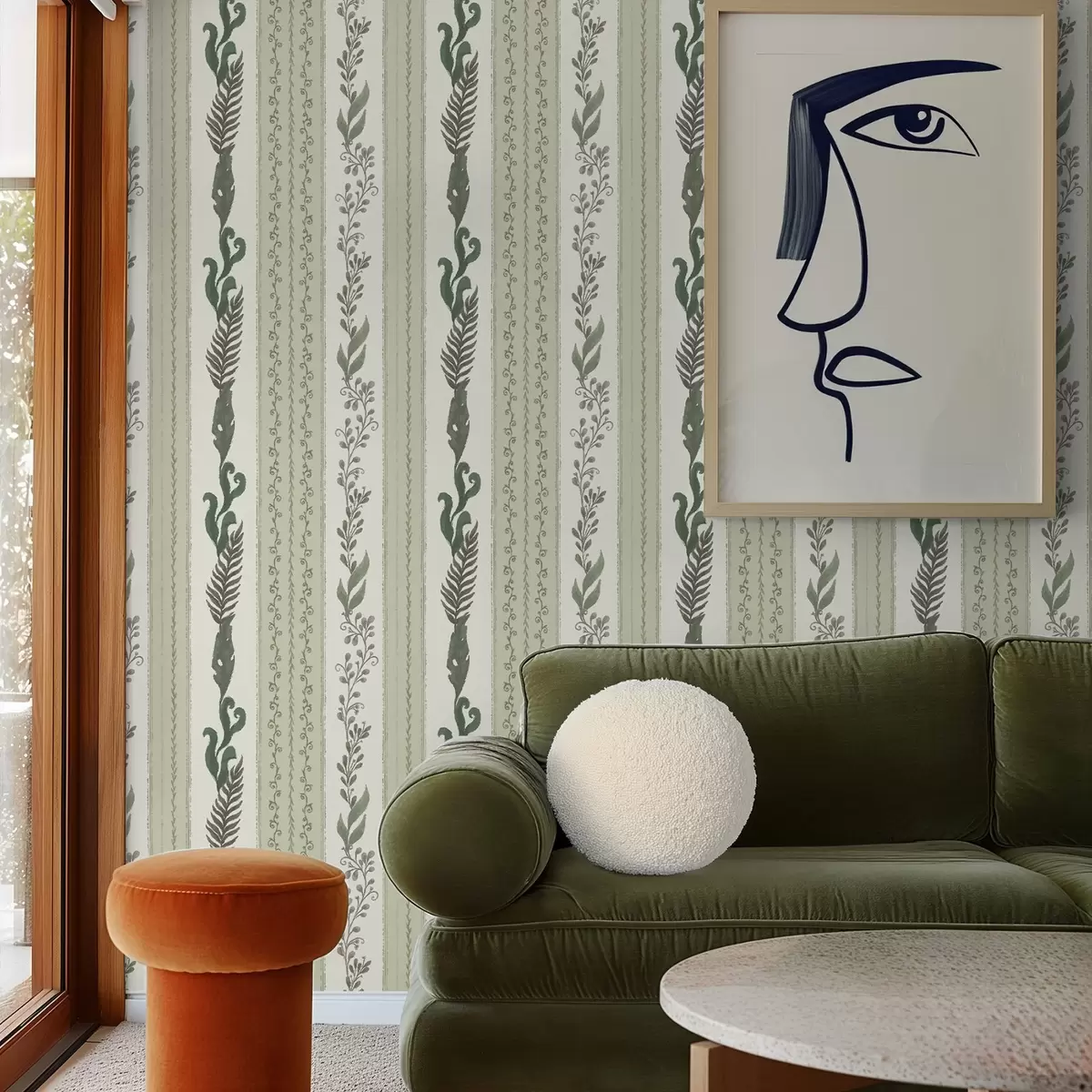 Behang Strepen met takken in groene en grijze tinten, zacht contrast Nr. a00824