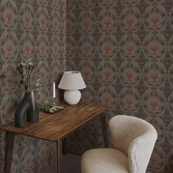 Behang Terracotta damast op gedempte olijfgroene achtergrond Nr. a00828v3