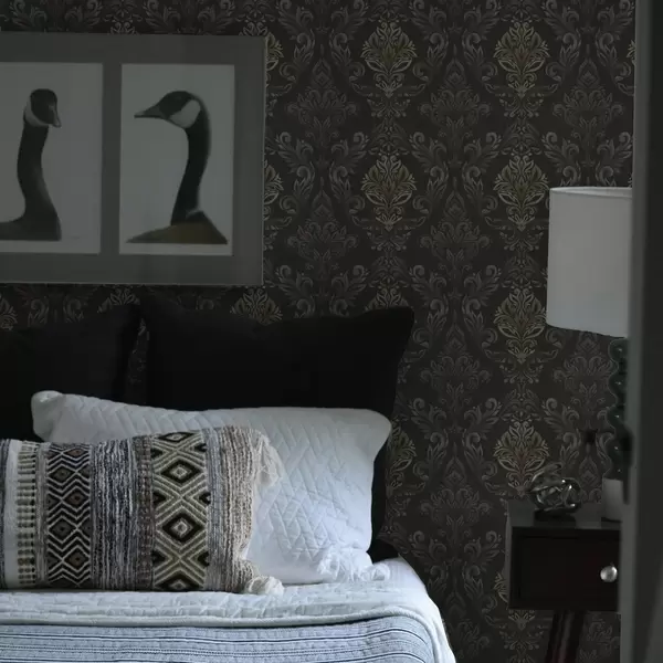 Behang Damast op donkere grafietgrond, olijf-oker accenten Nr. a00828v5