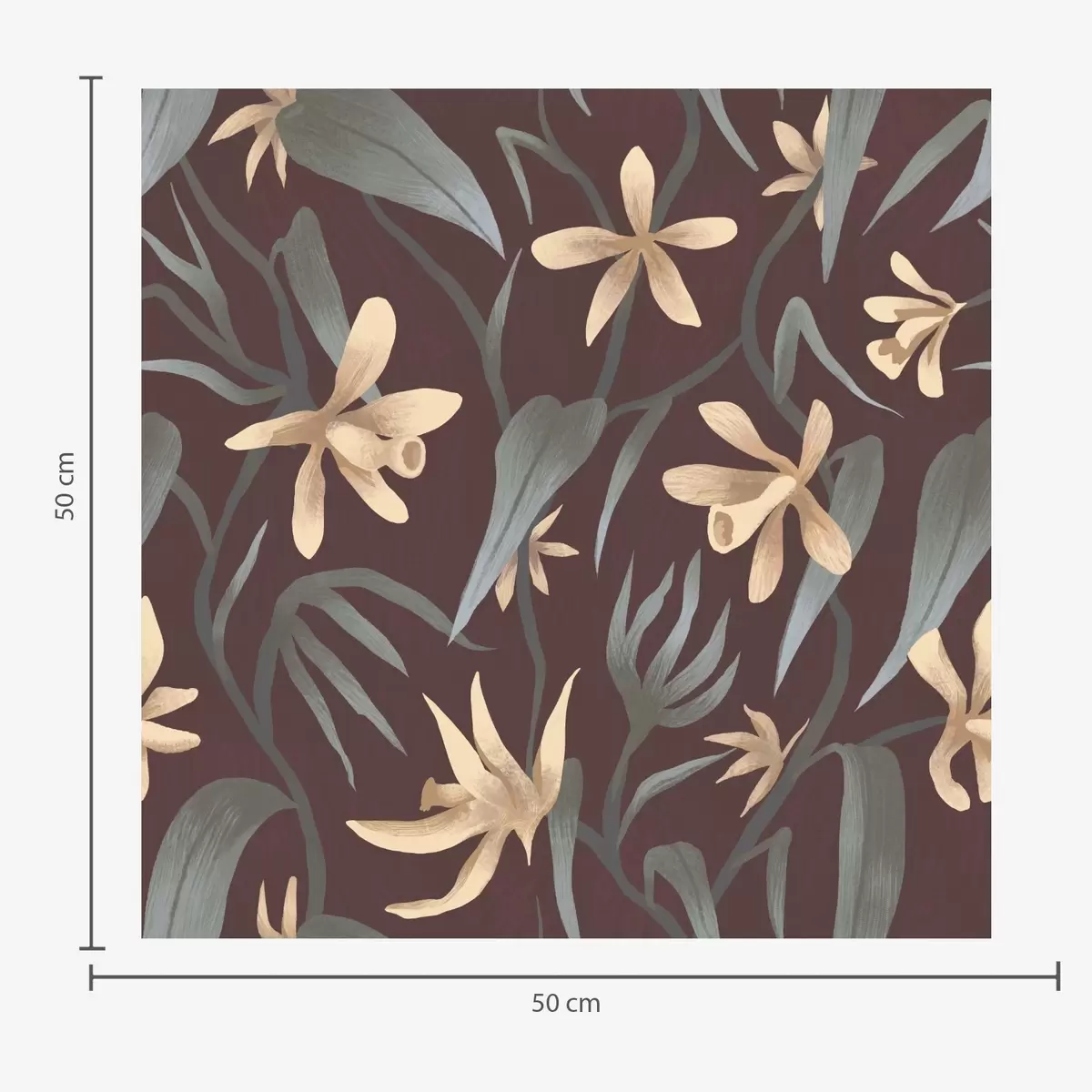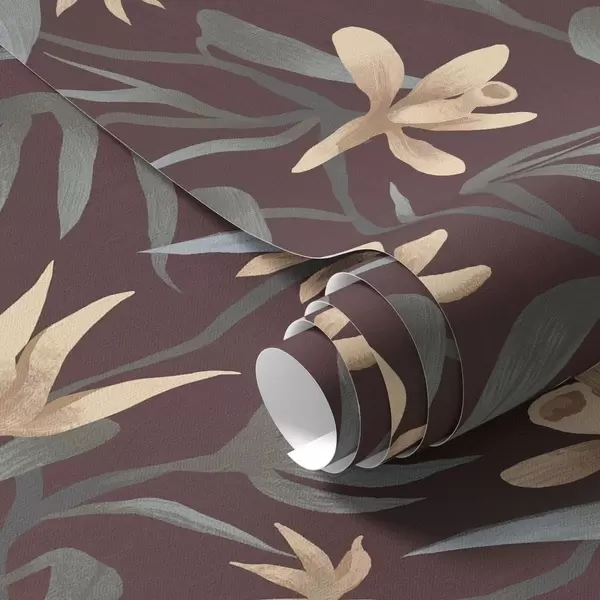 Behang Crèmekleurige bloemen met grijze bladeren op een bordeauxrode achtergrond Nr. a00833