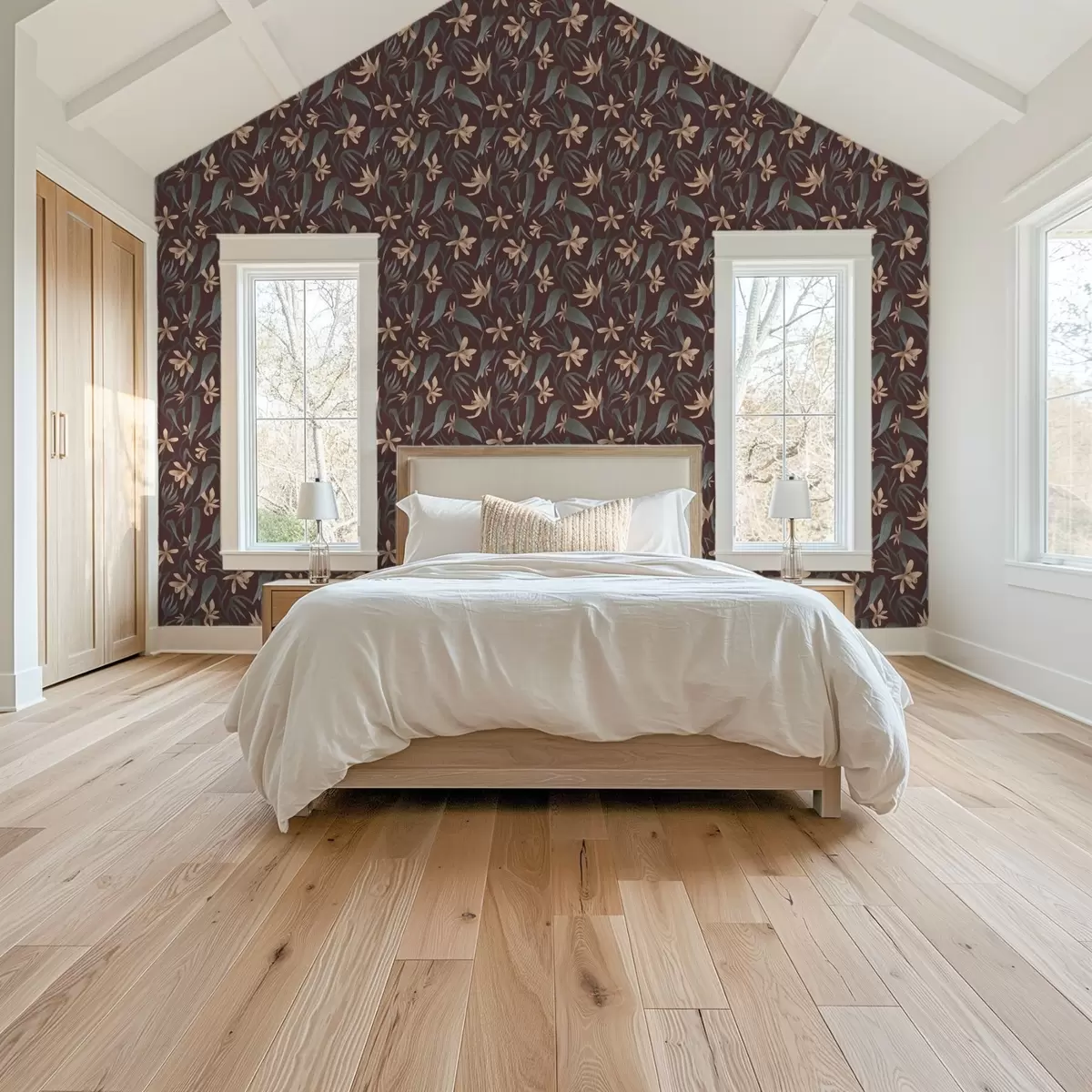 Behang Crèmekleurige bloemen met grijze bladeren op een bordeauxrode achtergrond Nr. a00833