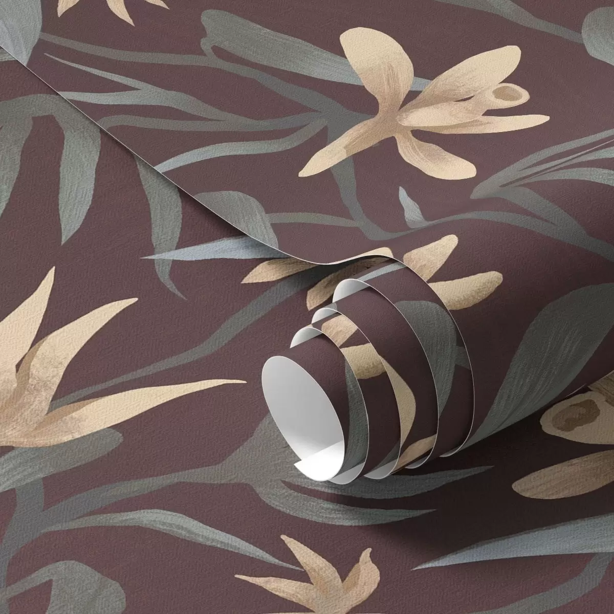 Behang Crèmekleurige bloemen met grijze bladeren op een bordeauxrode achtergrond Nr. a00833