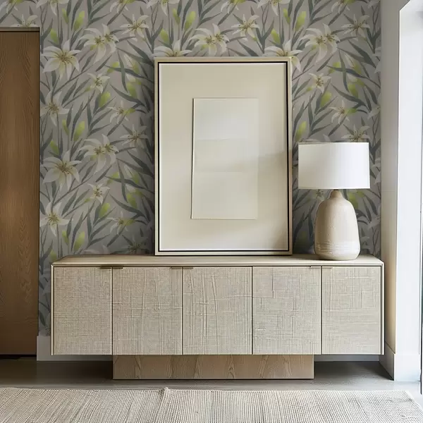 Behang Crèmekleurige lelies met bladeren op een grijsbeige achtergrond Nr. a00837