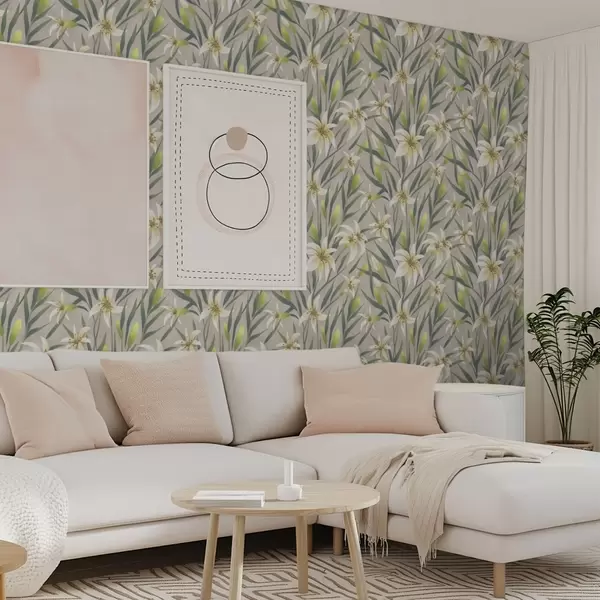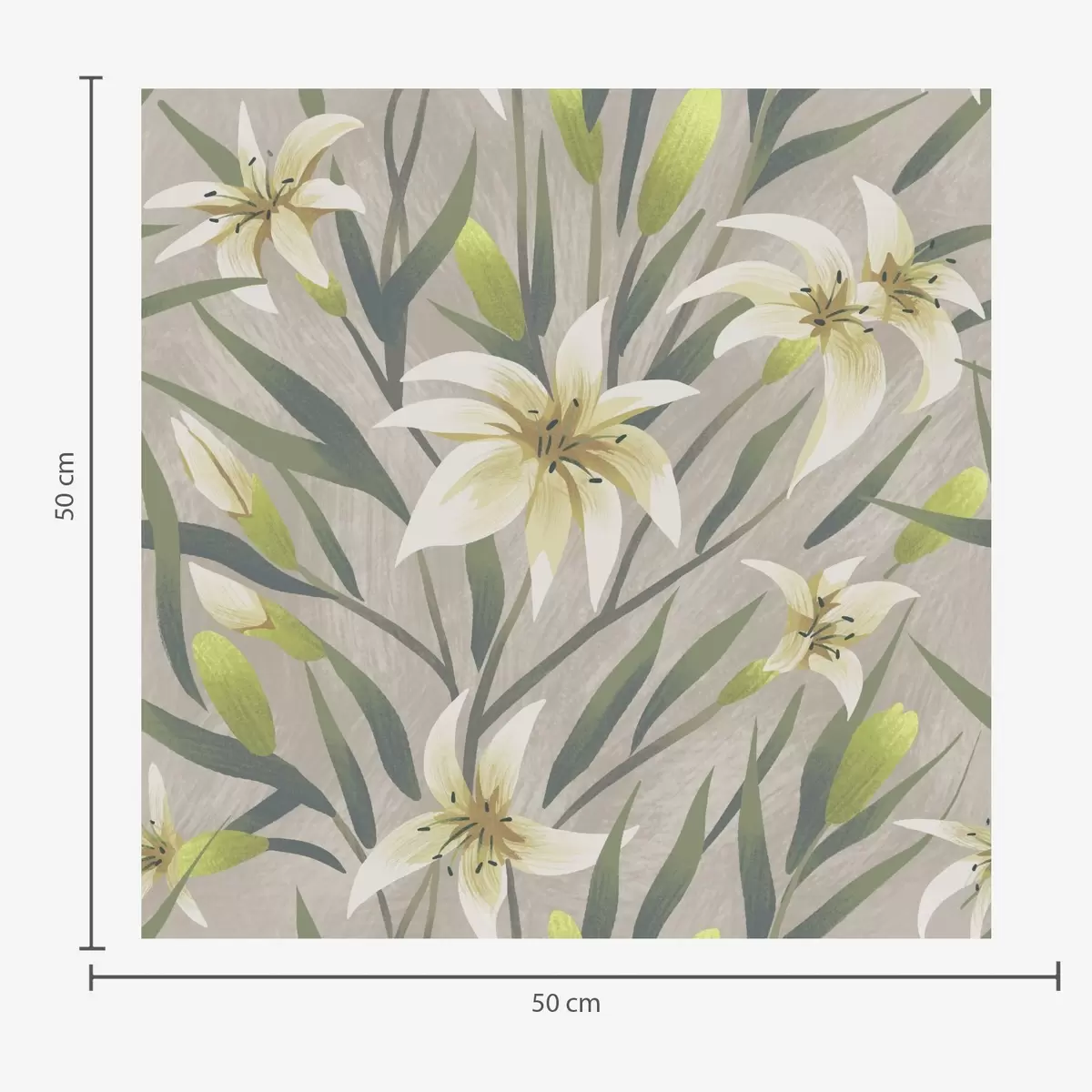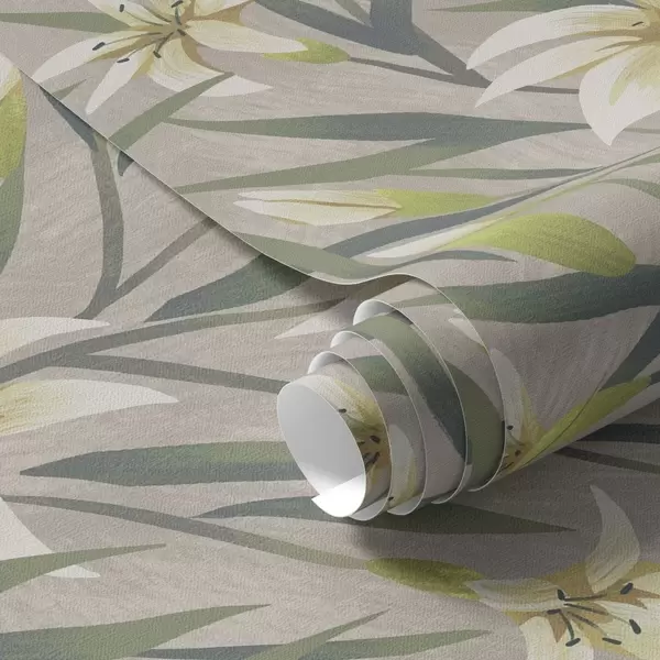 Behang Crèmekleurige lelies met bladeren op een grijsbeige achtergrond Nr. a00837
