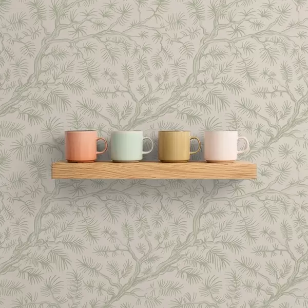 Behang Dennen takken in lichtgroene tinten op beige achtergrond Nr. a00838v1
