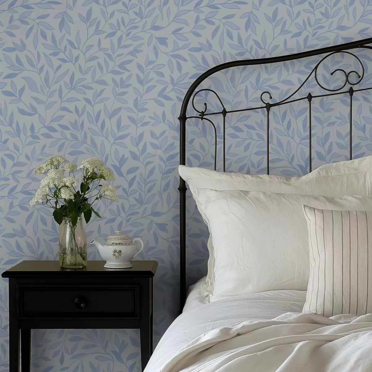 Behang Blauwe twijgen met bladeren op lichtblauw Nr. a00842