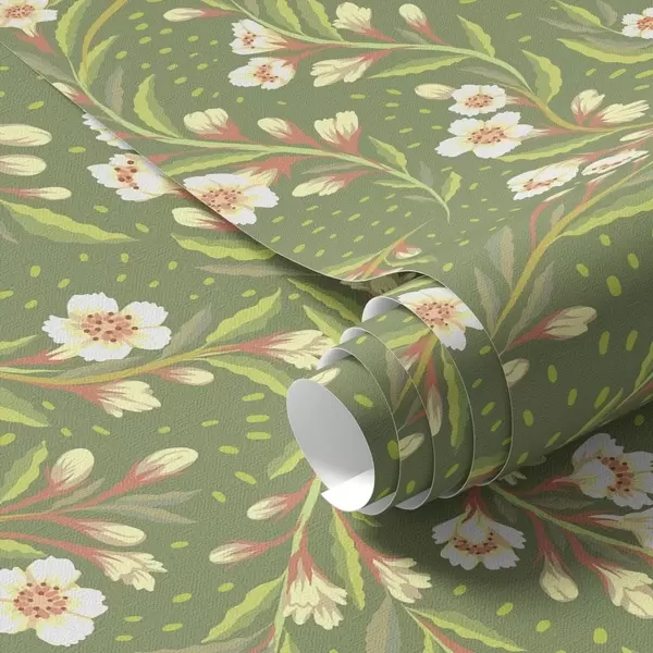 Behang Veegende takken met crèmekleurige bloemen op een olijfgroene achtergrond Nr. a00850
