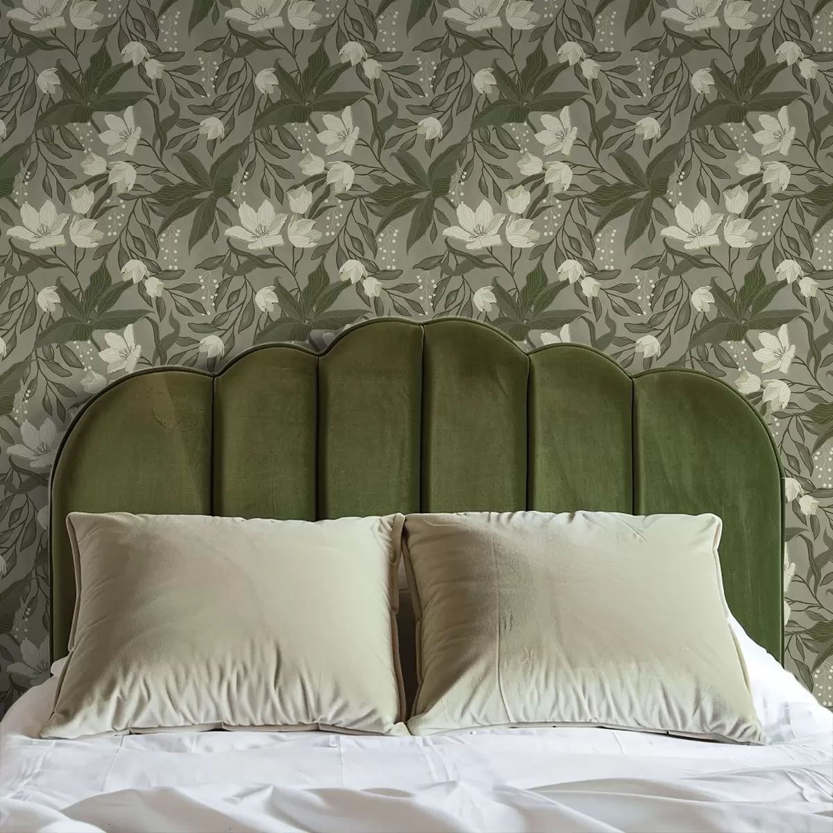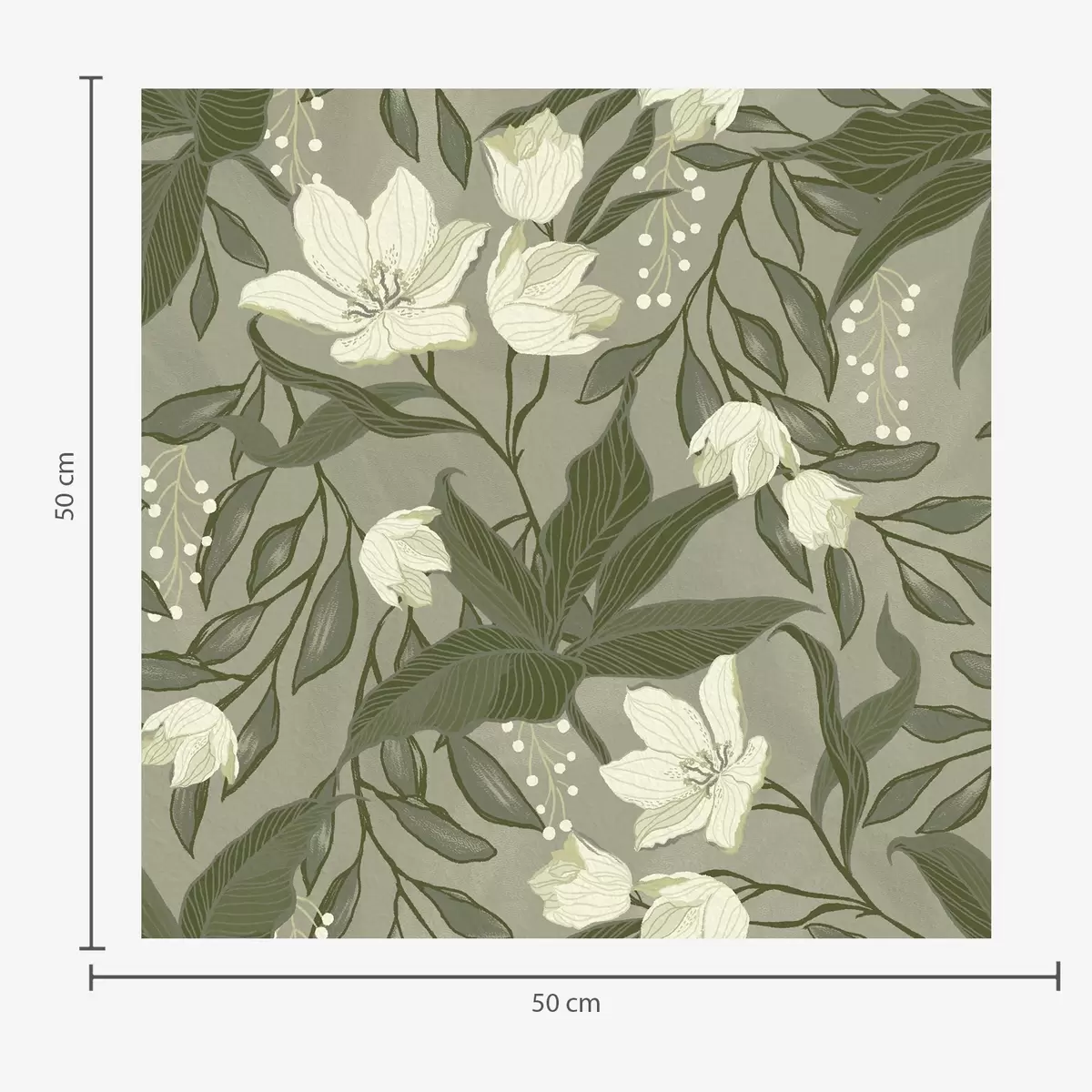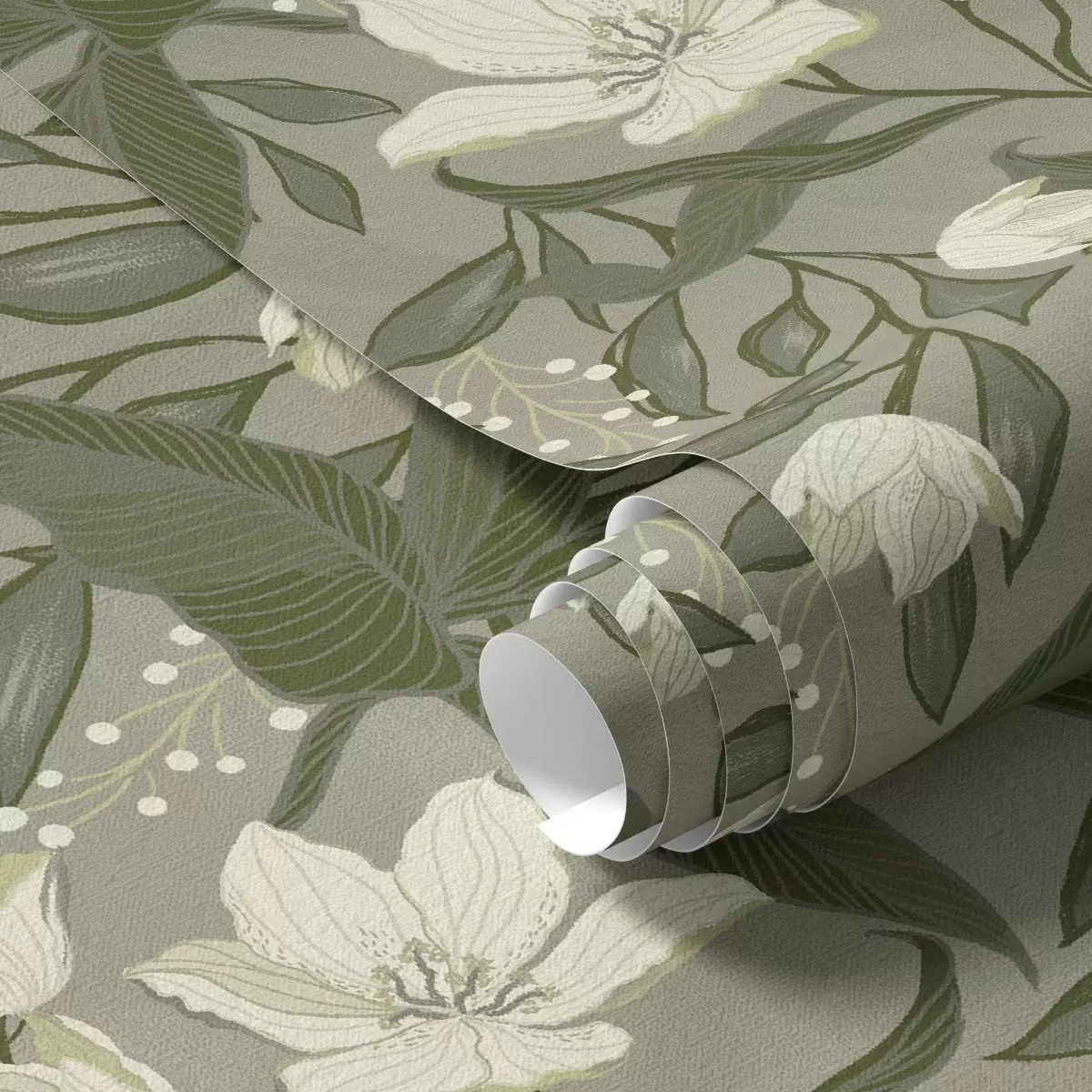 Behang Lichte lelies en bladeren op grijs-olijfgroen Nr. a00854