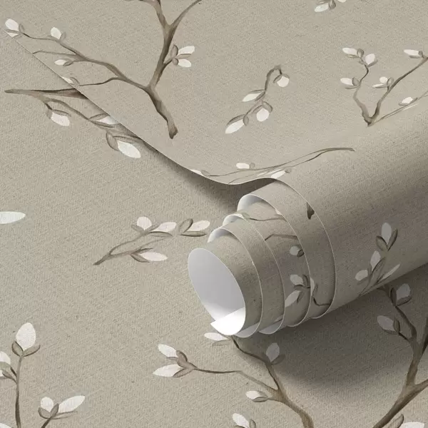 Behang Twijgen met witte knoppen op een taupe linnen achtergrond Nr. a00861