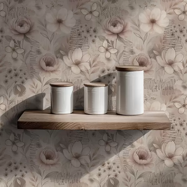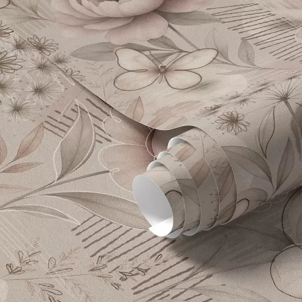 Behang Sepia beige bloemen met vlinder- en lineaire accenten Nr. a00870