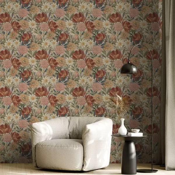 Behang Vintage tuin bloeit in warm terracotta en perzik Nr. a00874