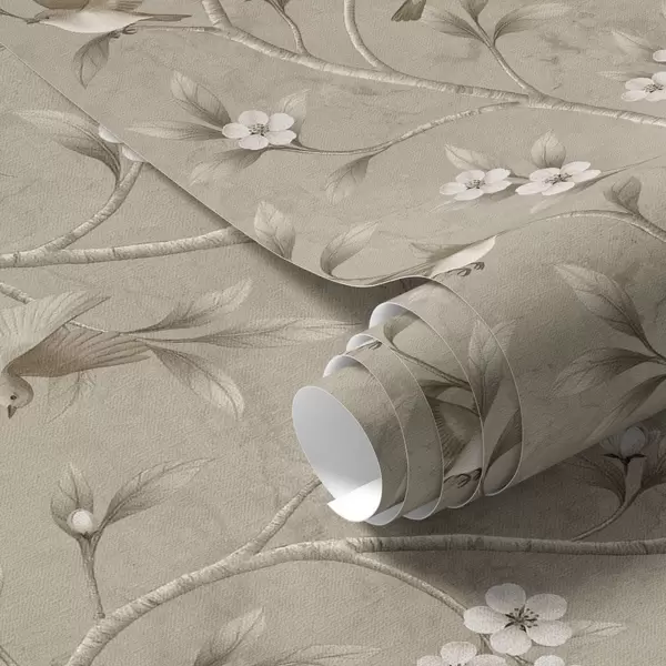 Behang Vogels en bloeiende takken in warme sepia-tinten Nr. a00882