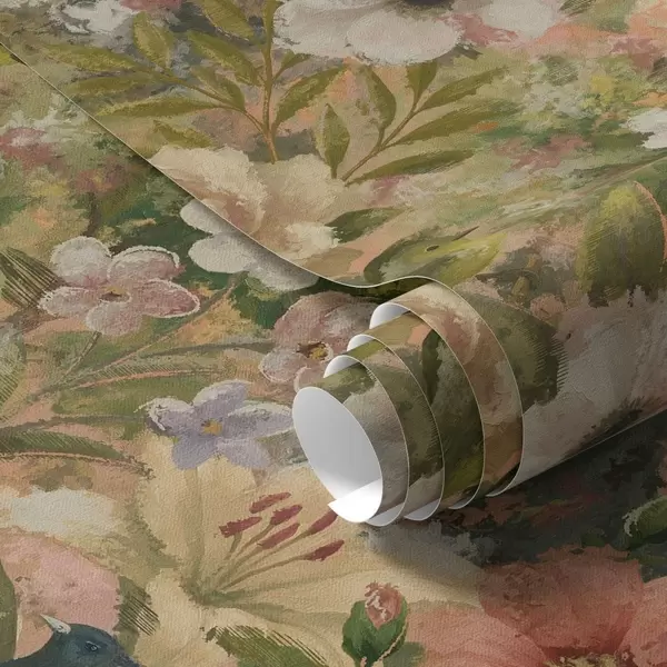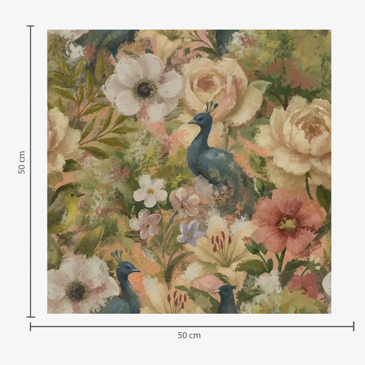 Behang Schilderachtige tuin met pauwen en grote bloemen Nr. a00885