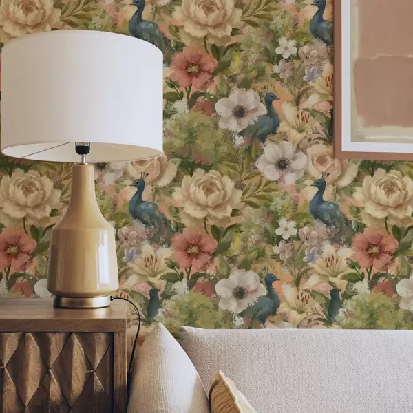 Behang Schilderachtige tuin met pauwen en grote bloemen Nr. a00885