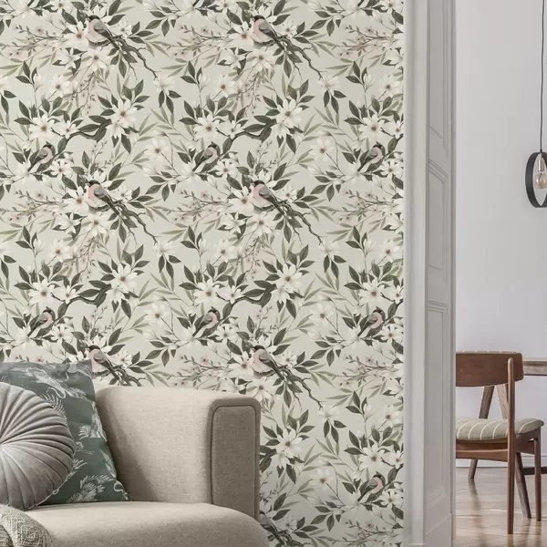 Behang Goudvinken met witte borstjes op takken met crèmekleurige bloemen Nr. a00889