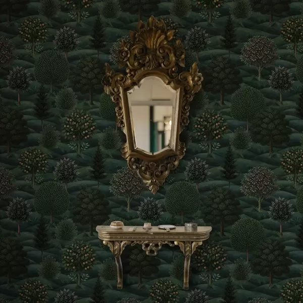 Behang Weelderig groen glooiend landschap met bomen in patronen a00892
