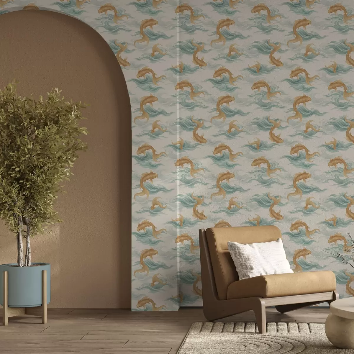 Behang Amberkleurige koivissen zwemmen tussen zachte turquoise golven Nr. a00894