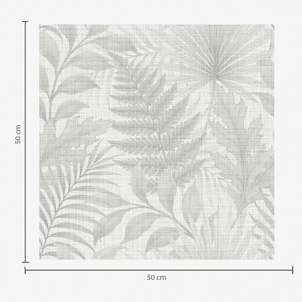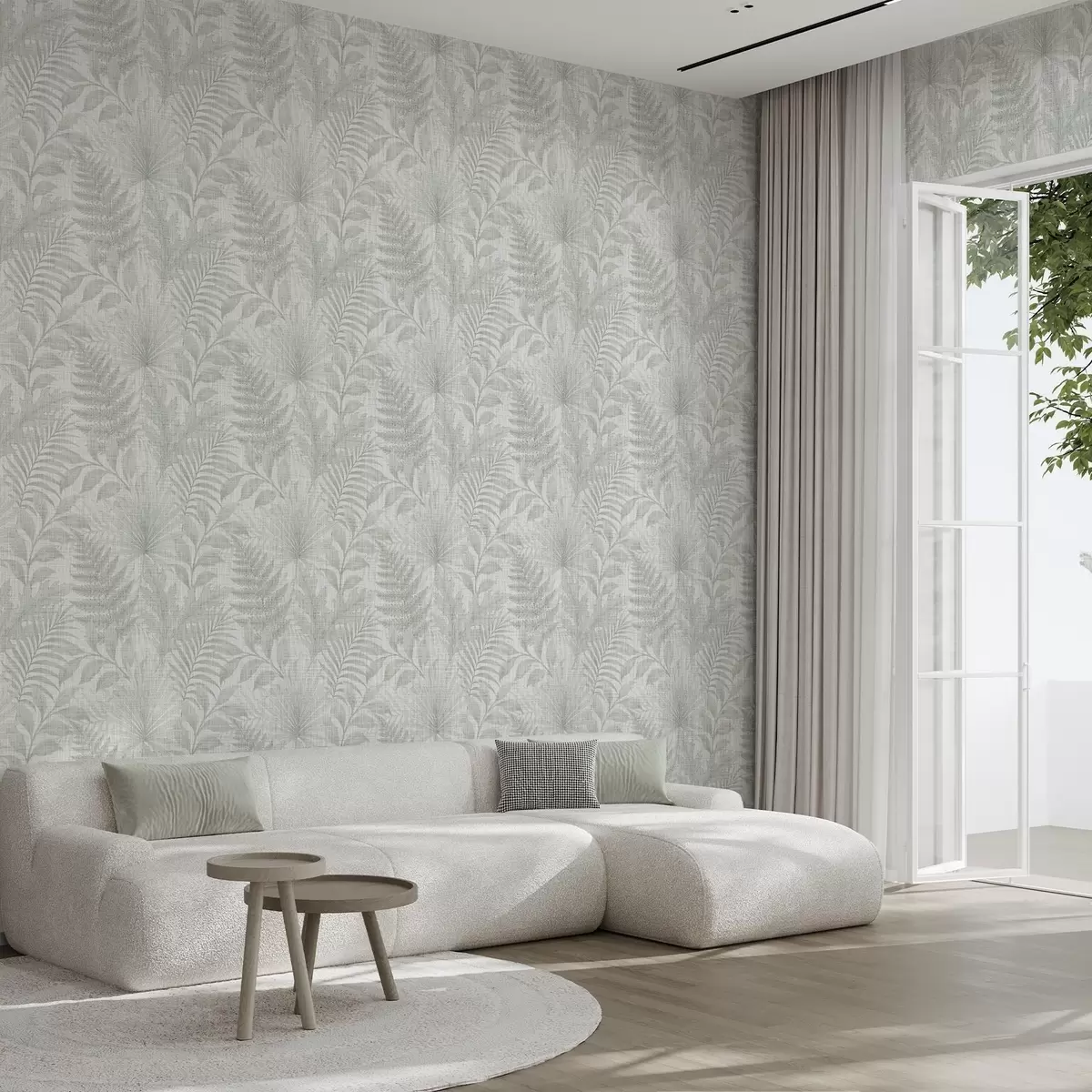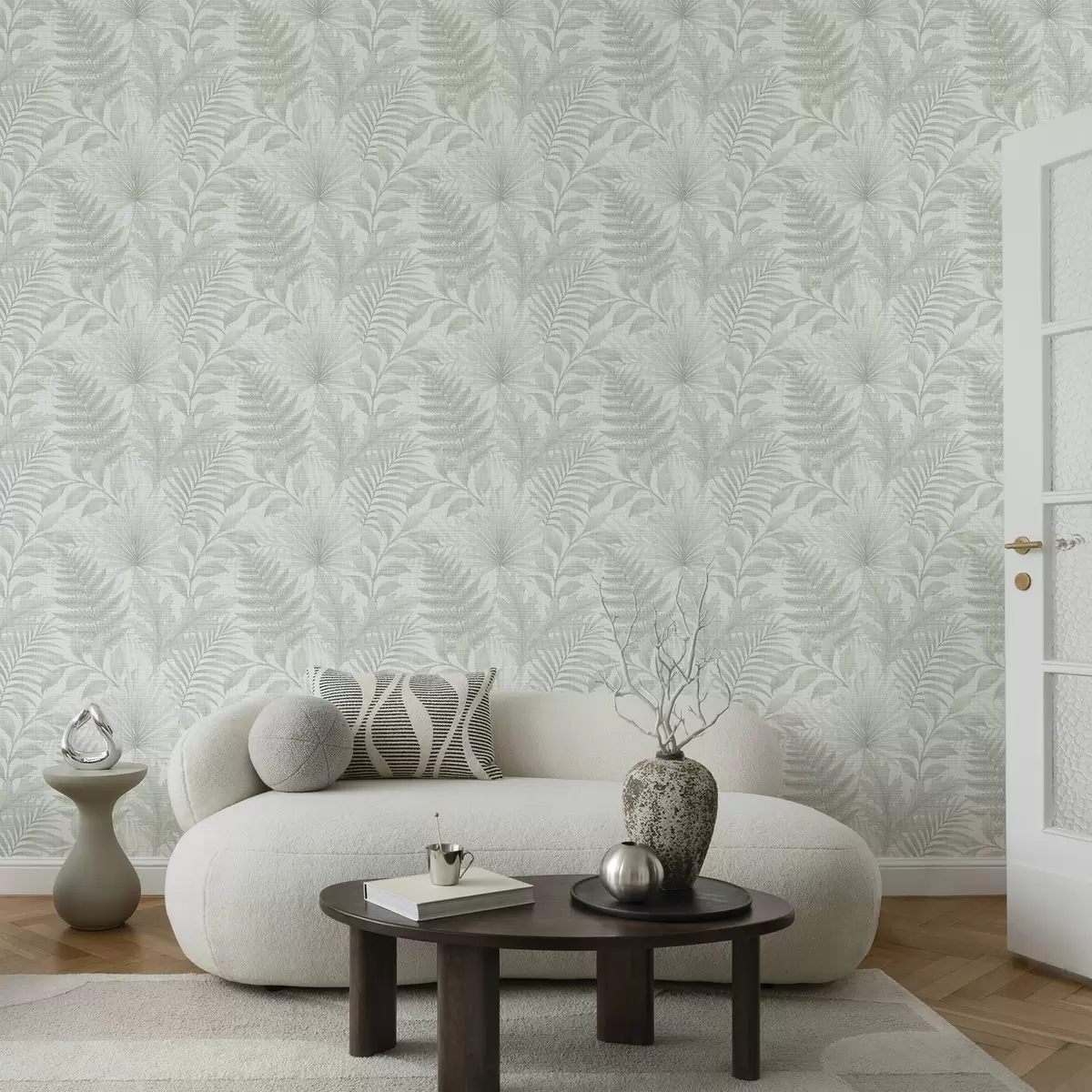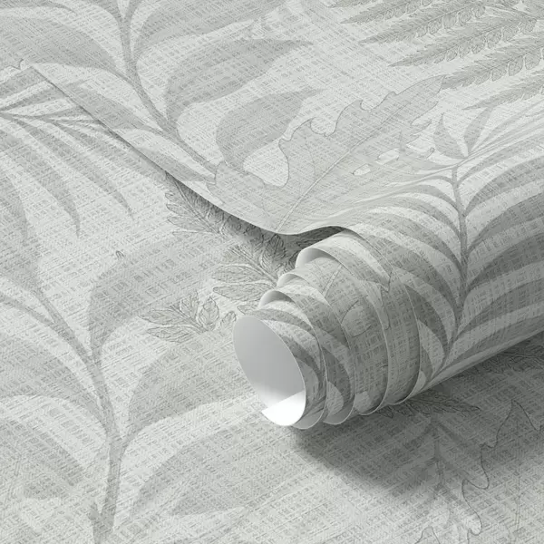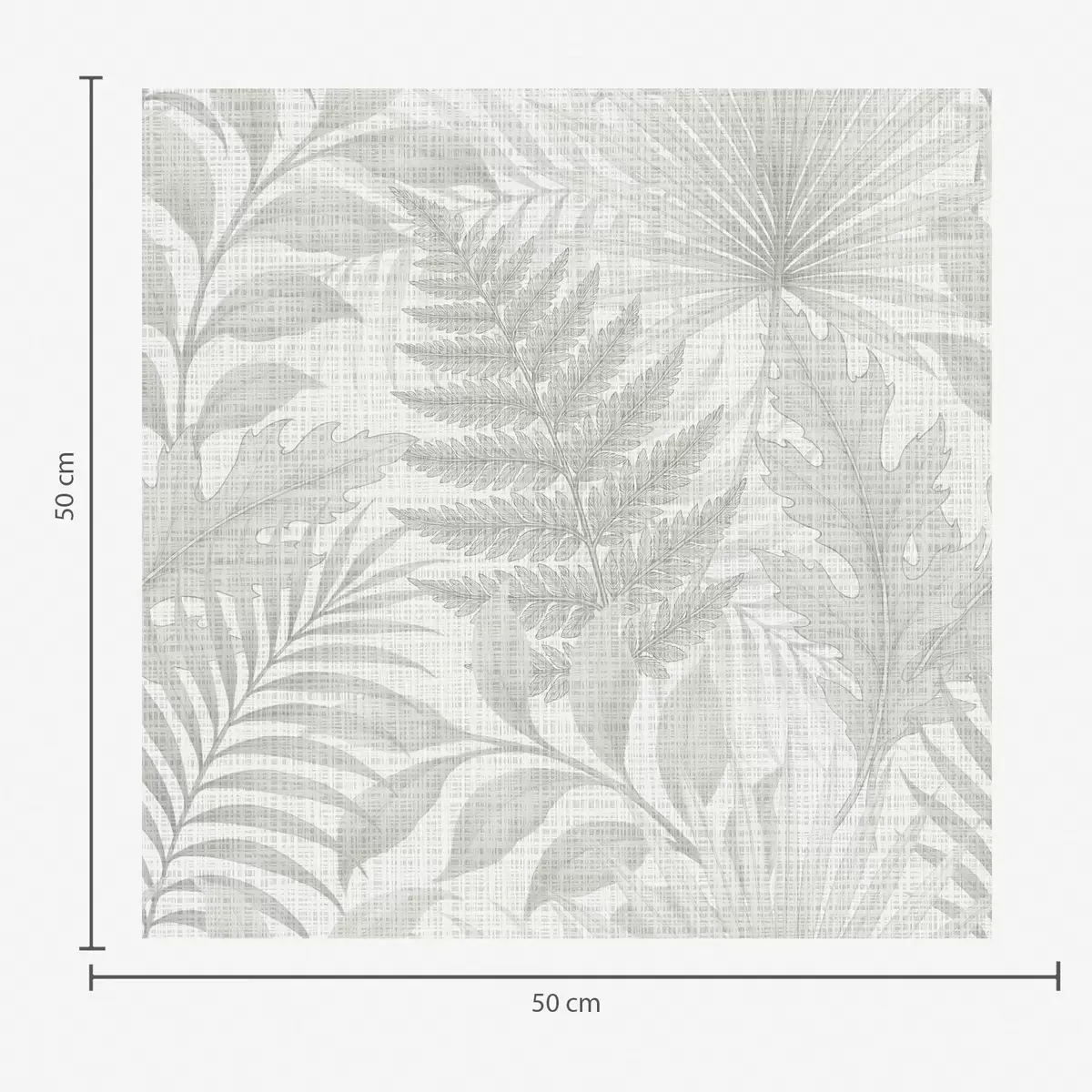 Behang Zachte tropische bladeren in lichtgrijs op linnenstructuur Nr. a00899