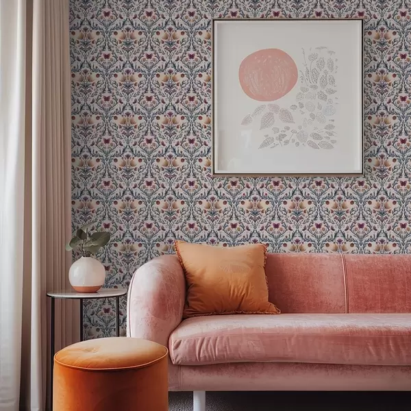 Behang Bloemenmotief met vlinders op een zachte perzikkleurige achtergrond Nr. a00926