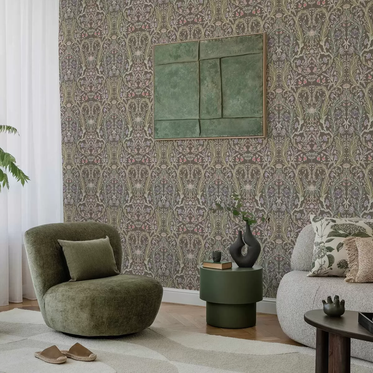 Behang Symmetrische bloemen en bladeren op een bruingrijze achtergrond Nr. a00928v2