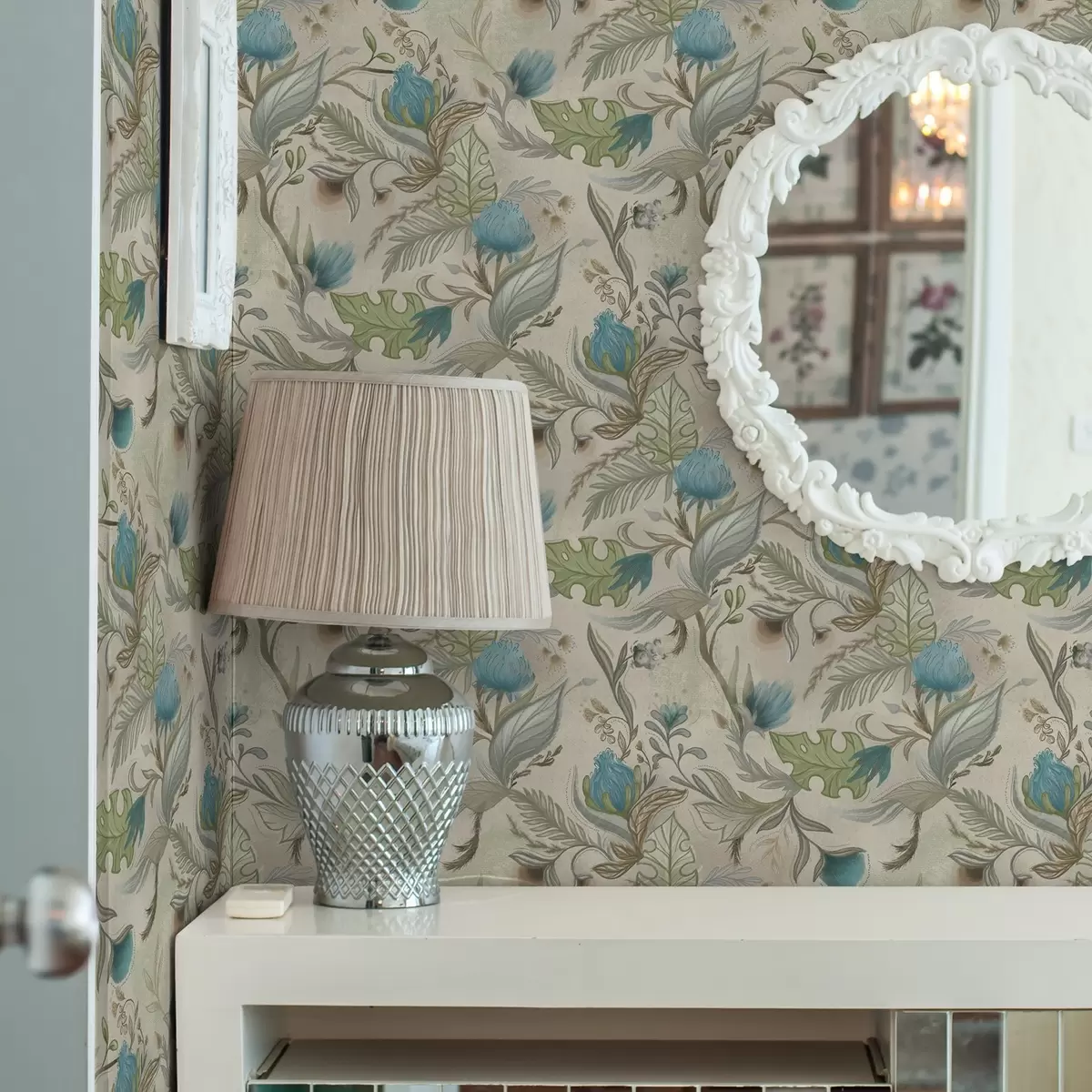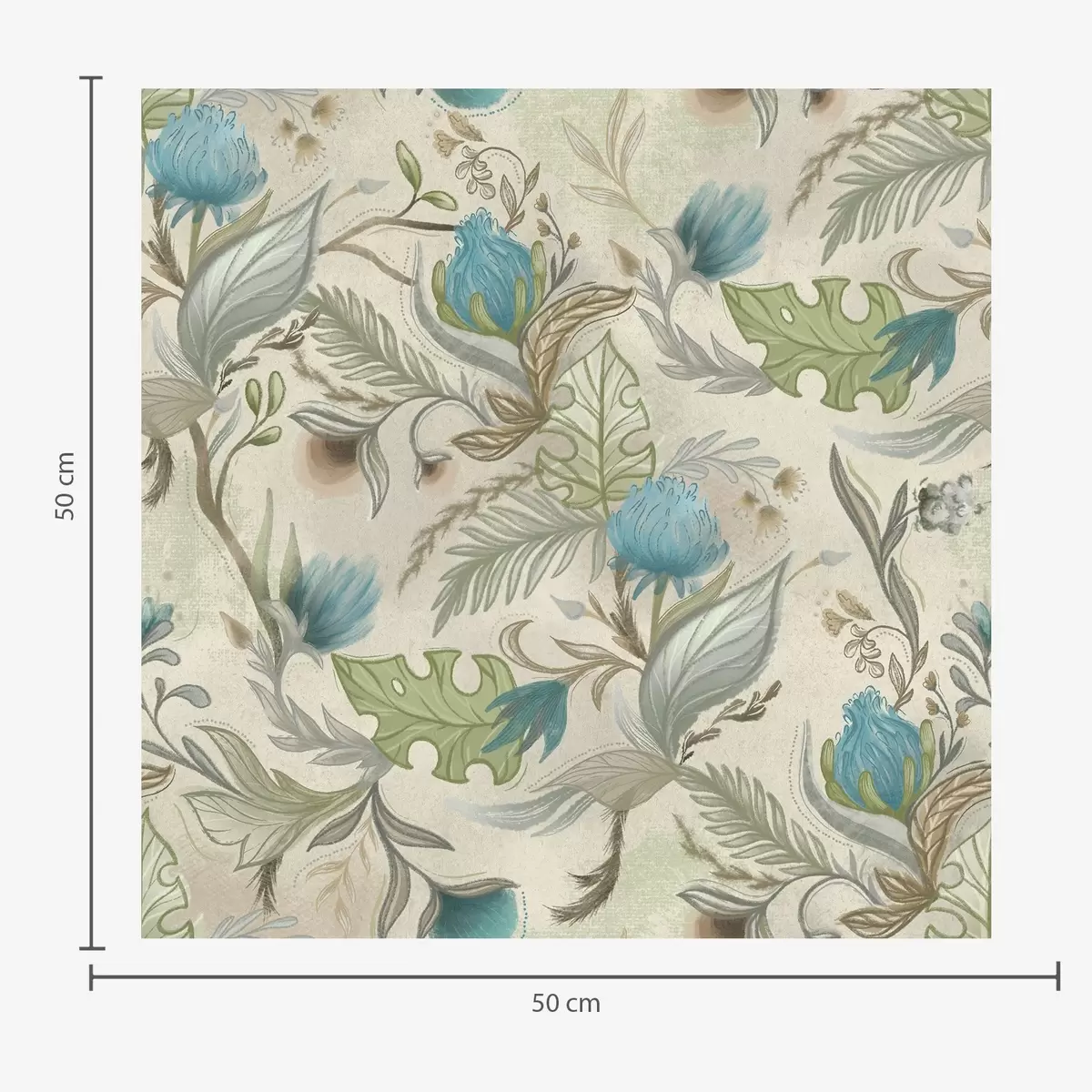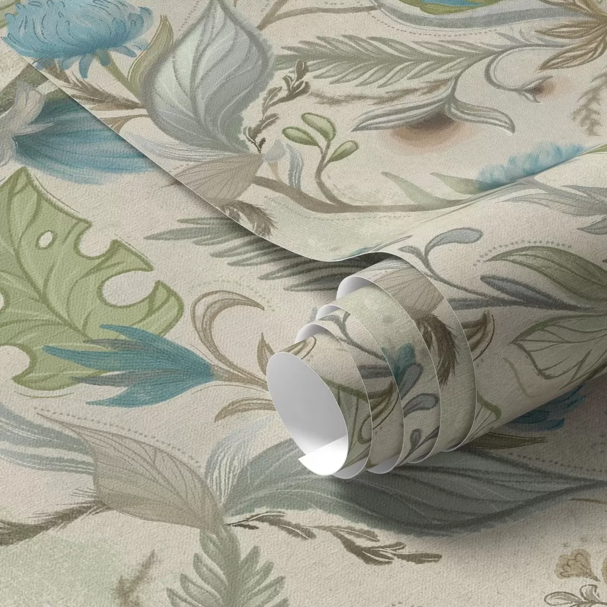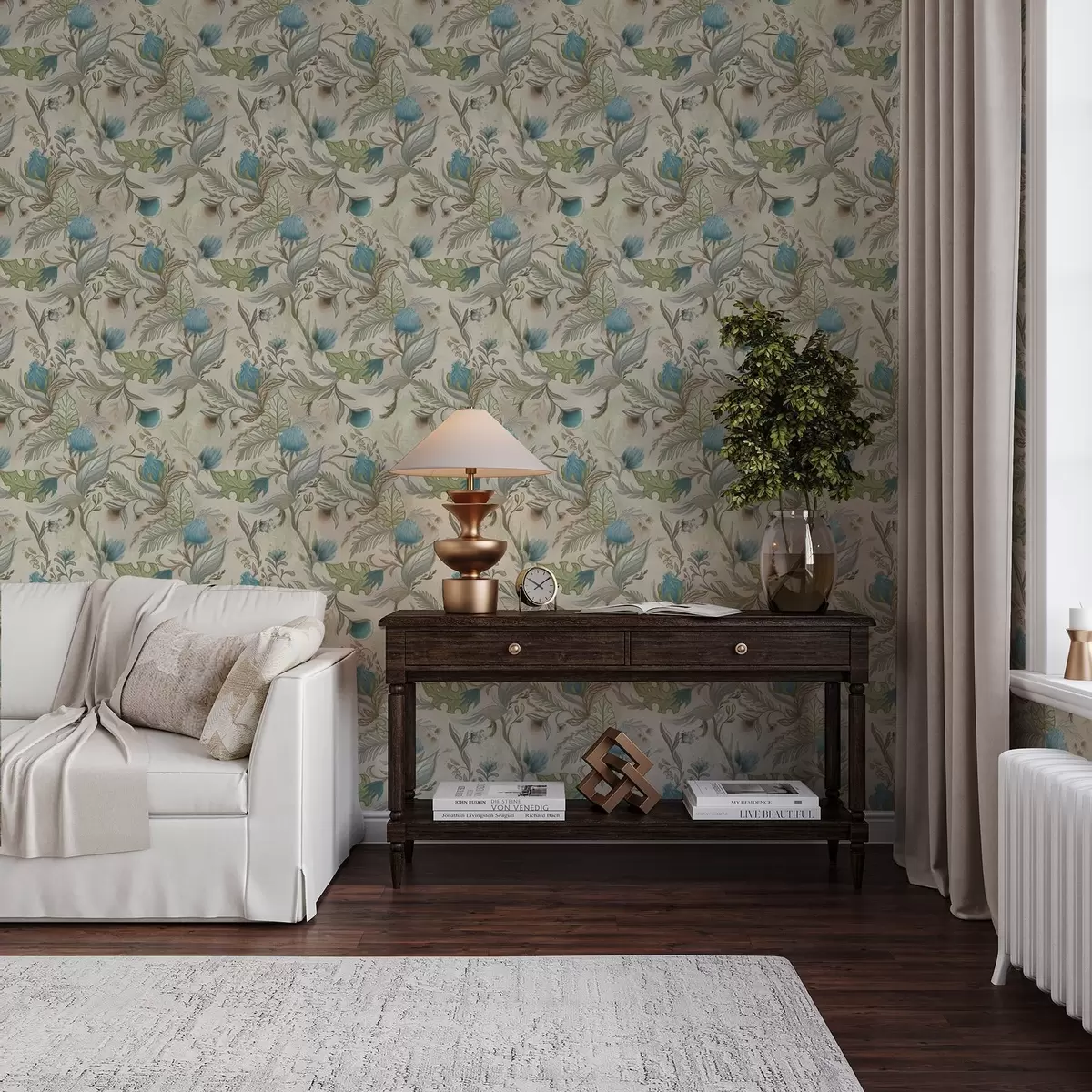 Behang Blauwe knoppen en bladeren op een lichtbeige achtergrond Nr. a00930