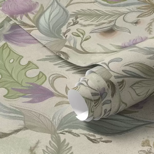 Behang Lila knoppen en zachtgroen op een crèmekleurige achtergrond Nr. a00930v2