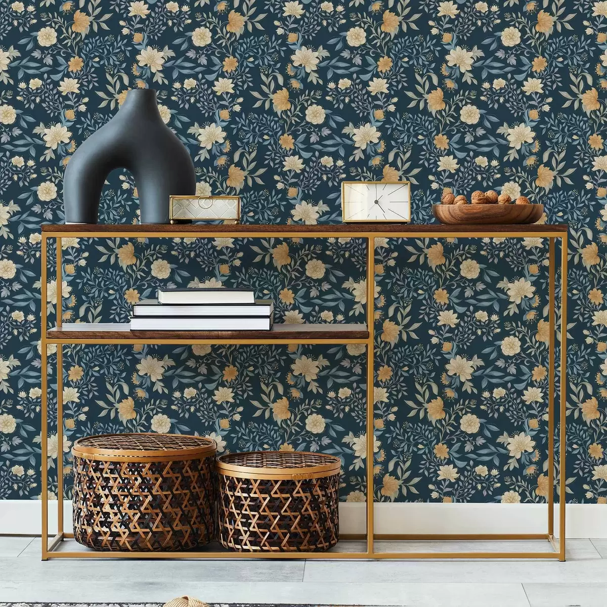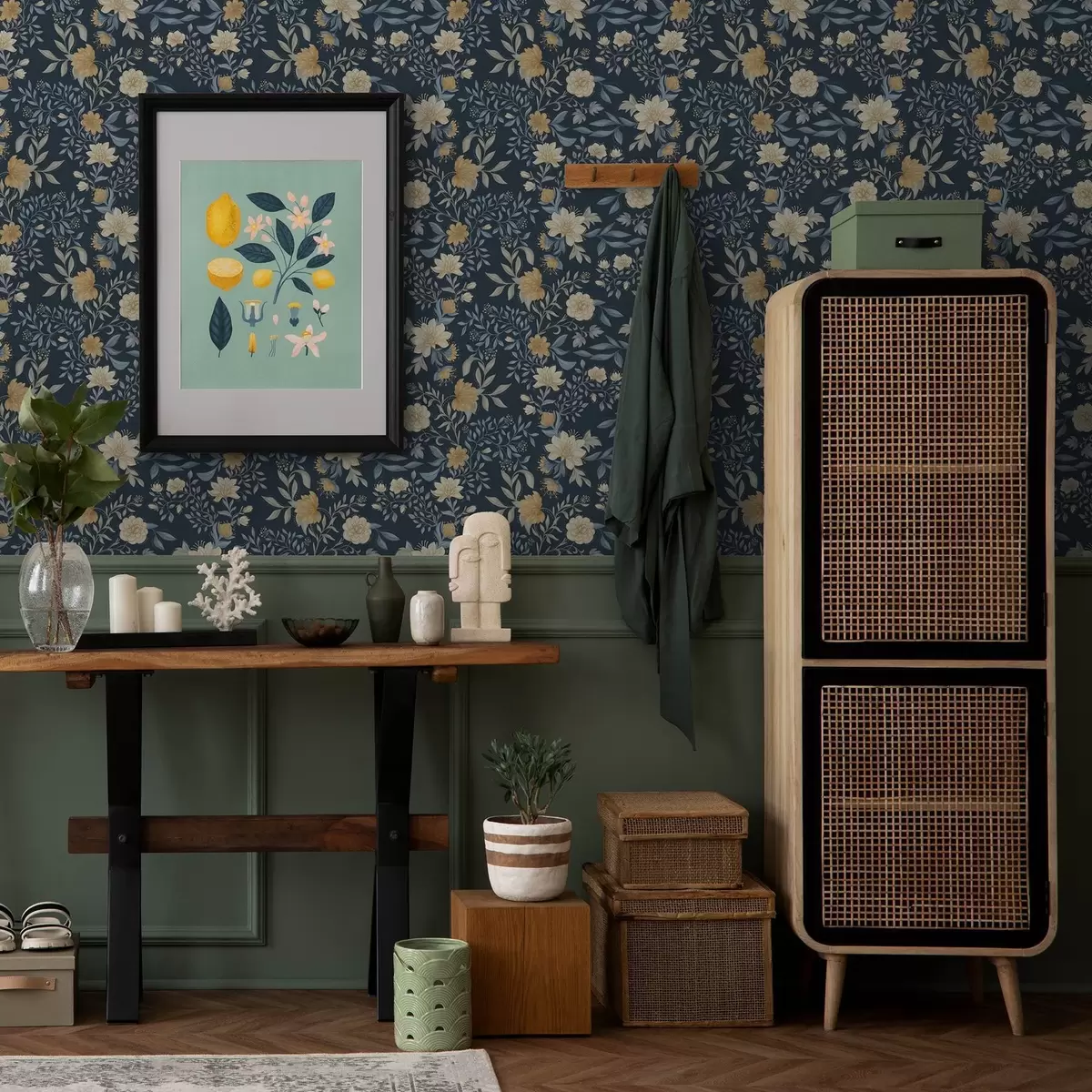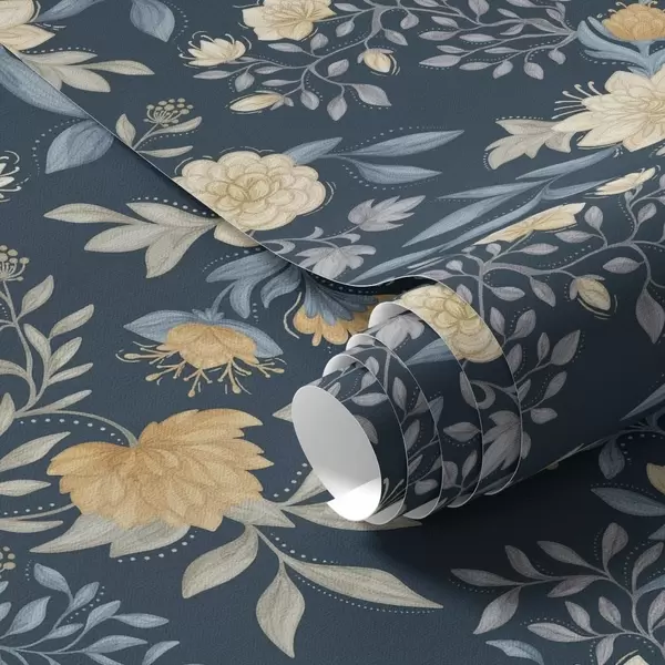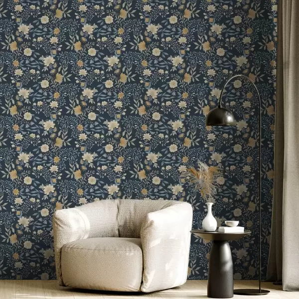 Behang Gele en blauwe bloemen op een donkere avondblauwe achtergrond Nr. a00934v1