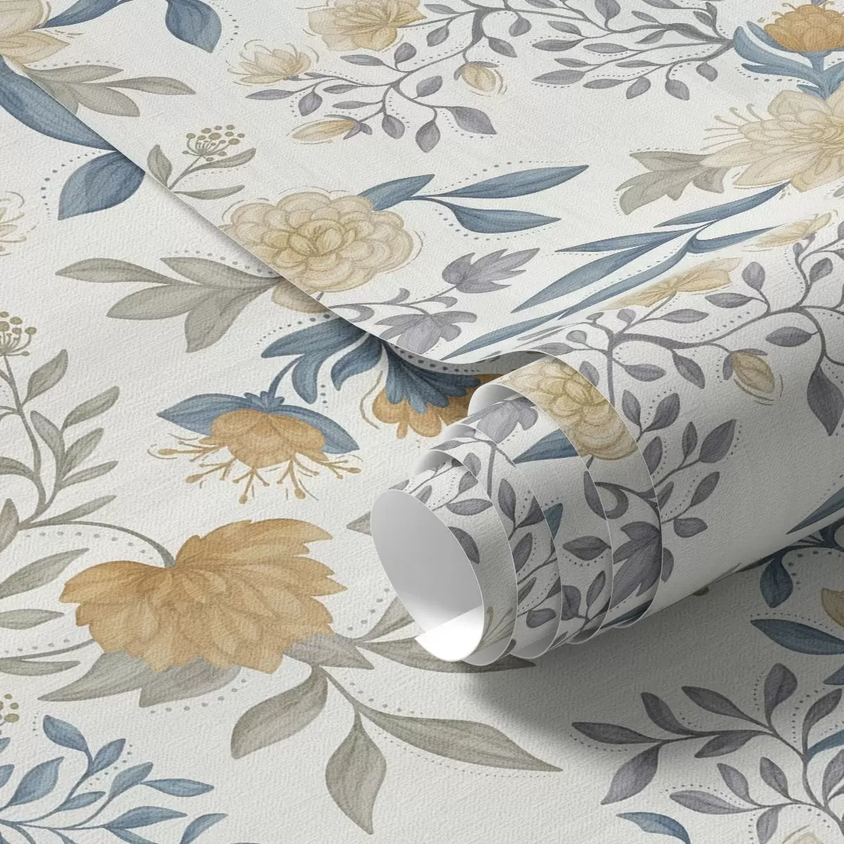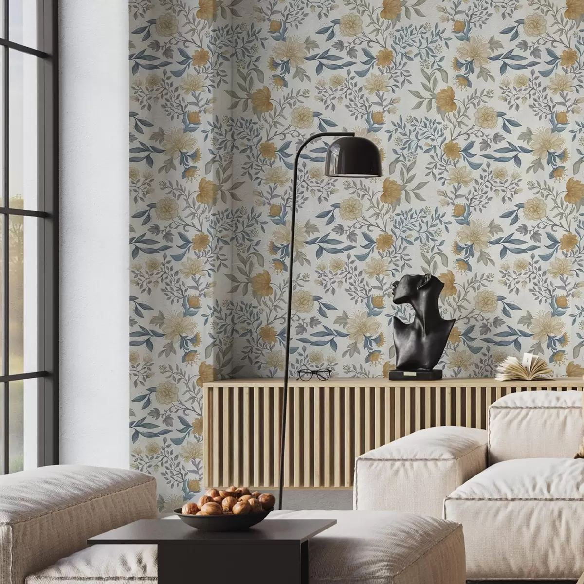Behang Gele bloemen en blauwgroen gebladerte op een melkwitte achtergrond Nr. a00934v2