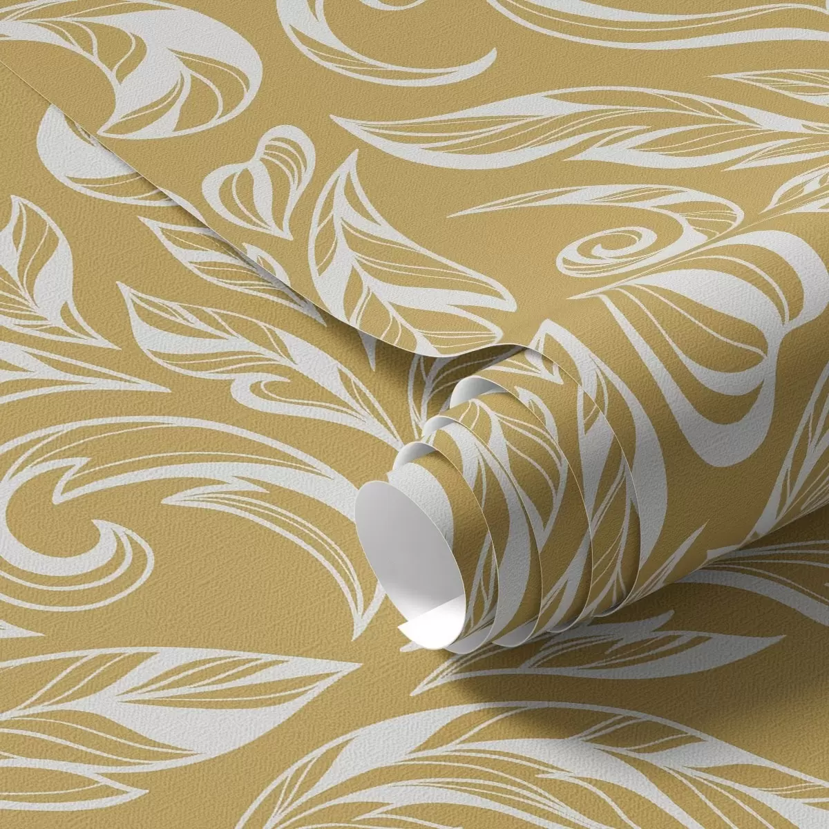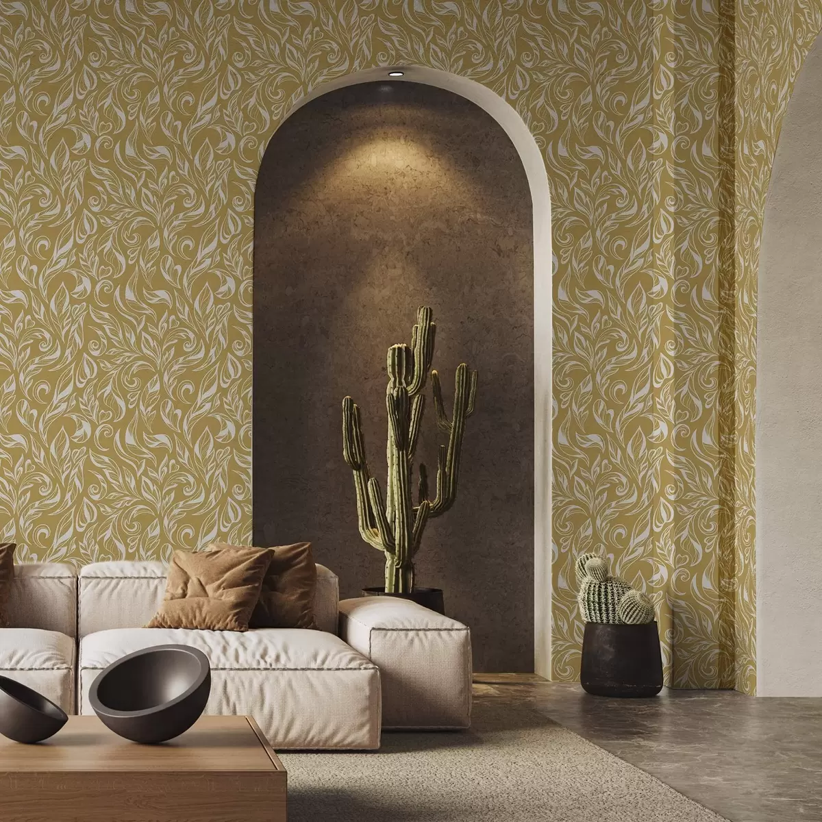 Behang Crèmekleurig bladornament op een warme okerkleurige achtergrond Nr. a00940v1