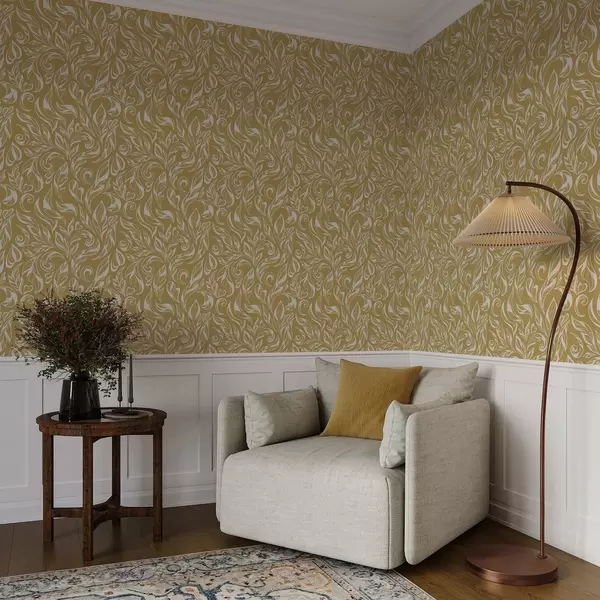 Behang Crèmekleurig bladornament op een warme okerkleurige achtergrond Nr. a00940v1